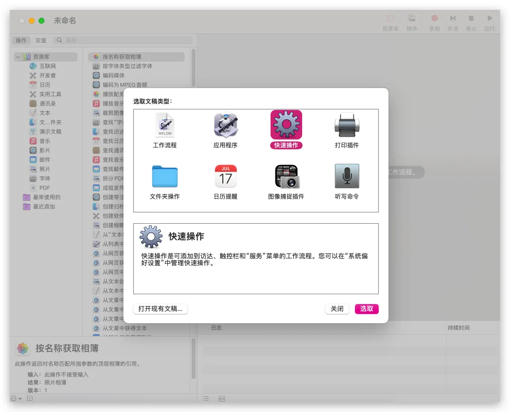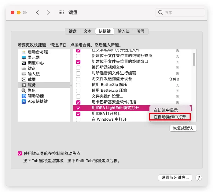 【笔记】MacOS自动操作 发表于 2021-04-22 更新于 2025-12-19 阅读次数: 前言MacOS使用自动操作.app创建快速操作项目,并以服务功能在系统菜单中出现 创建服务 快速操作.app->新建文稿->快速操作->选取 编辑工作流->保存工作流并为服务命名 编辑服务 系统偏好设置->键盘->快捷键->服务->找到保存的快速操作->右键->在自动操作中打开 服务文件存放位置~/Library/Services 完成