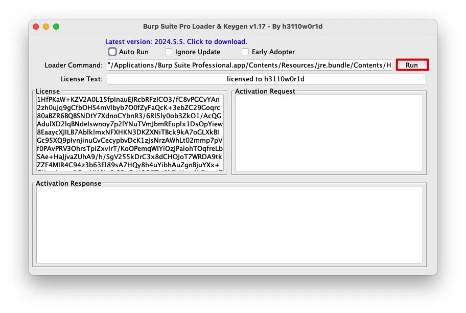 1 | /Applications/Burp\ Suite\ Professional.app/Contents/Resources/jre.bundle/Contents/Home/bin/java -jar /Applications/Burp\ Suite\ Professional.app/Contents/Resources/app/BurpLoaderKeygen_v1.17.jar |