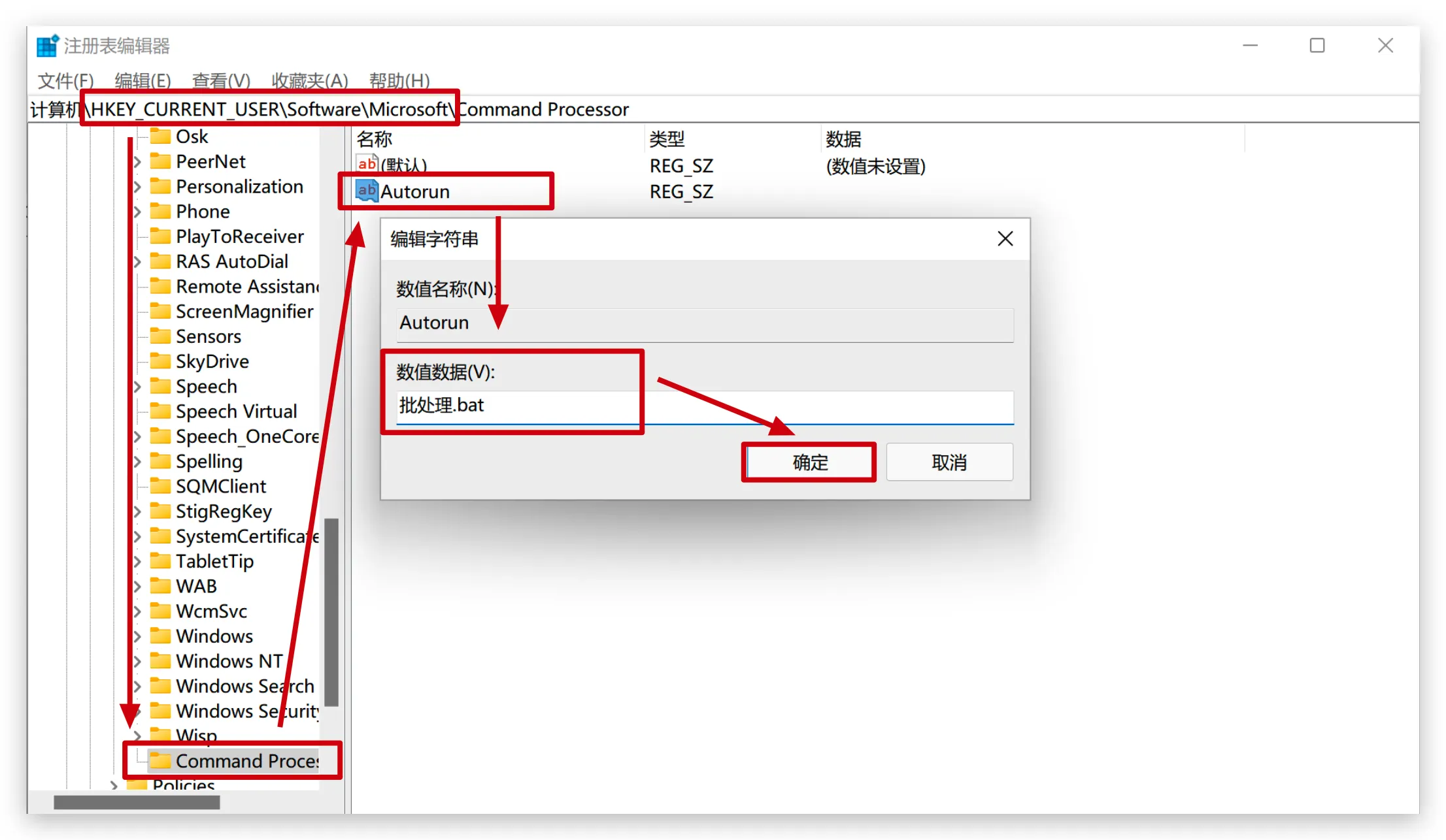regedit注册表编辑器->HKEY_CURRENT_USER\Software\Microsoft\->如果没有Command Processor子项,则新建一个项Command Processor->新建一个字符串值,数值名称为AutoRun,数值数据为批处理文件的绝对路径->确定