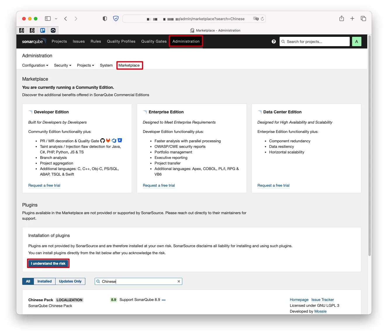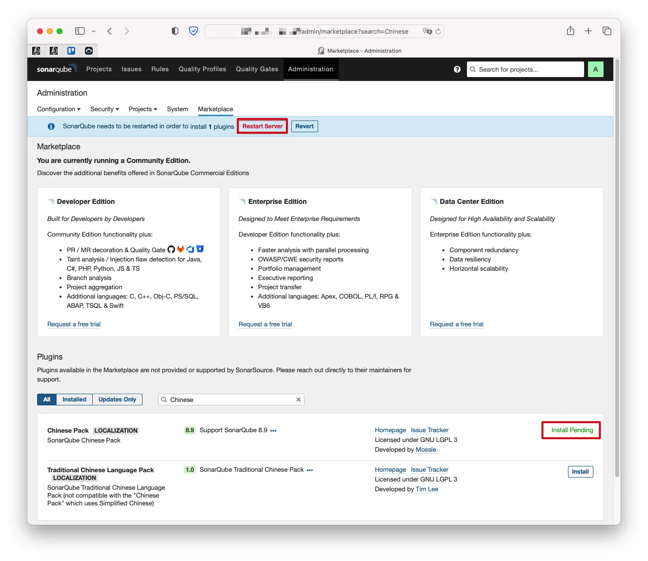 【笔记】SonarQube设置中文 发表于 2023-07-26 更新于 2025-12-19 阅读次数: 前言SonarQube设置中文 下载插件 Administrator->Markeyplace->I understand the risk同意协议 搜索Chinese->Install 安装完成后提示Install Pending->选择Restart Server重启 完成 截图纪念 参考文献哔哩哔哩——云原生技术架构