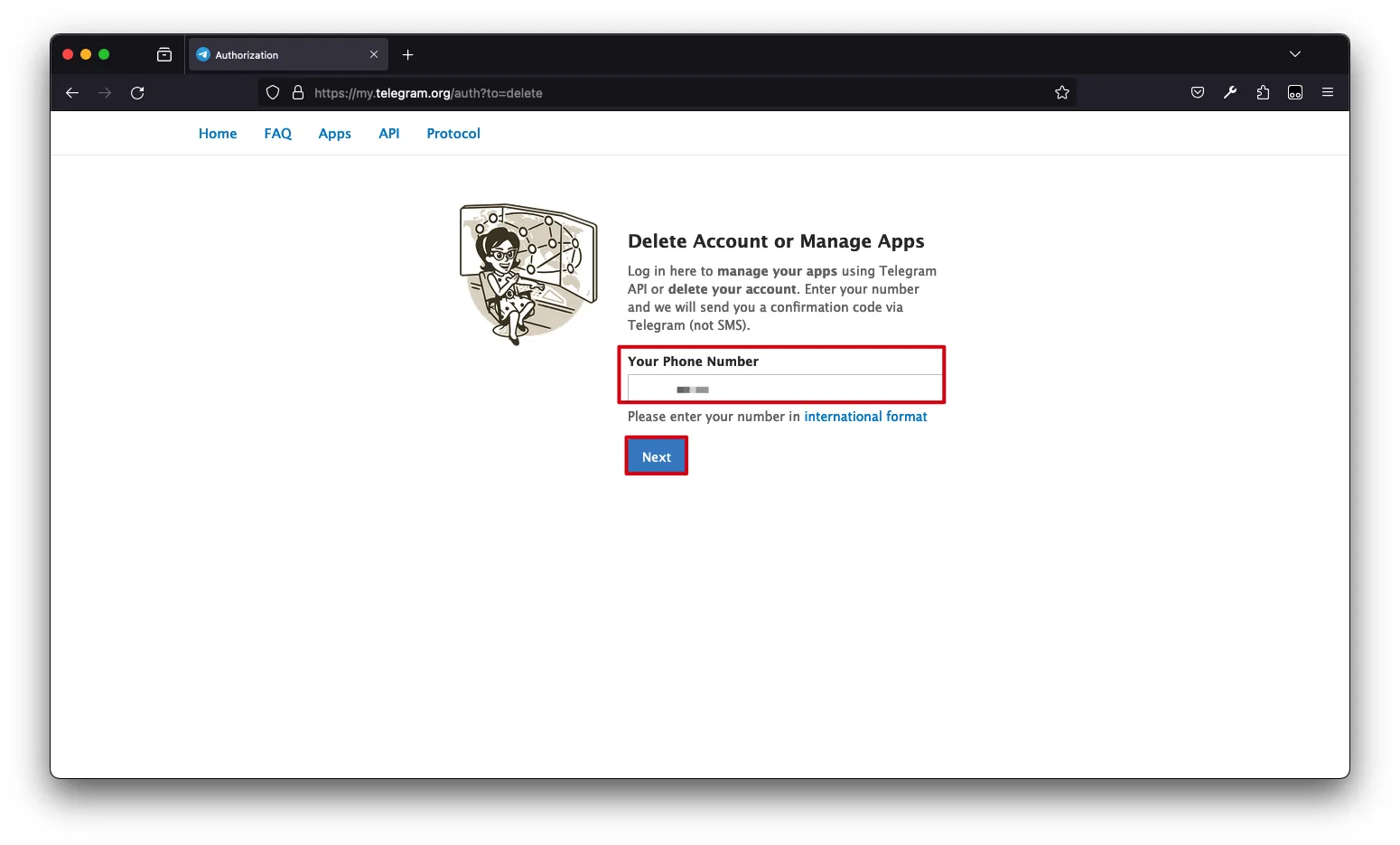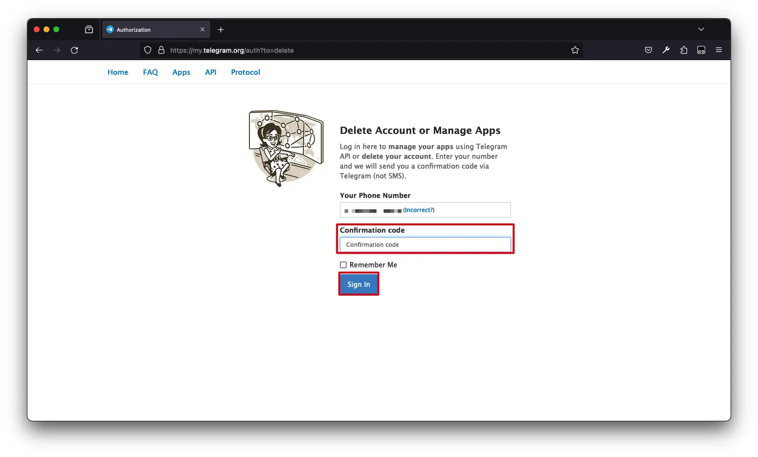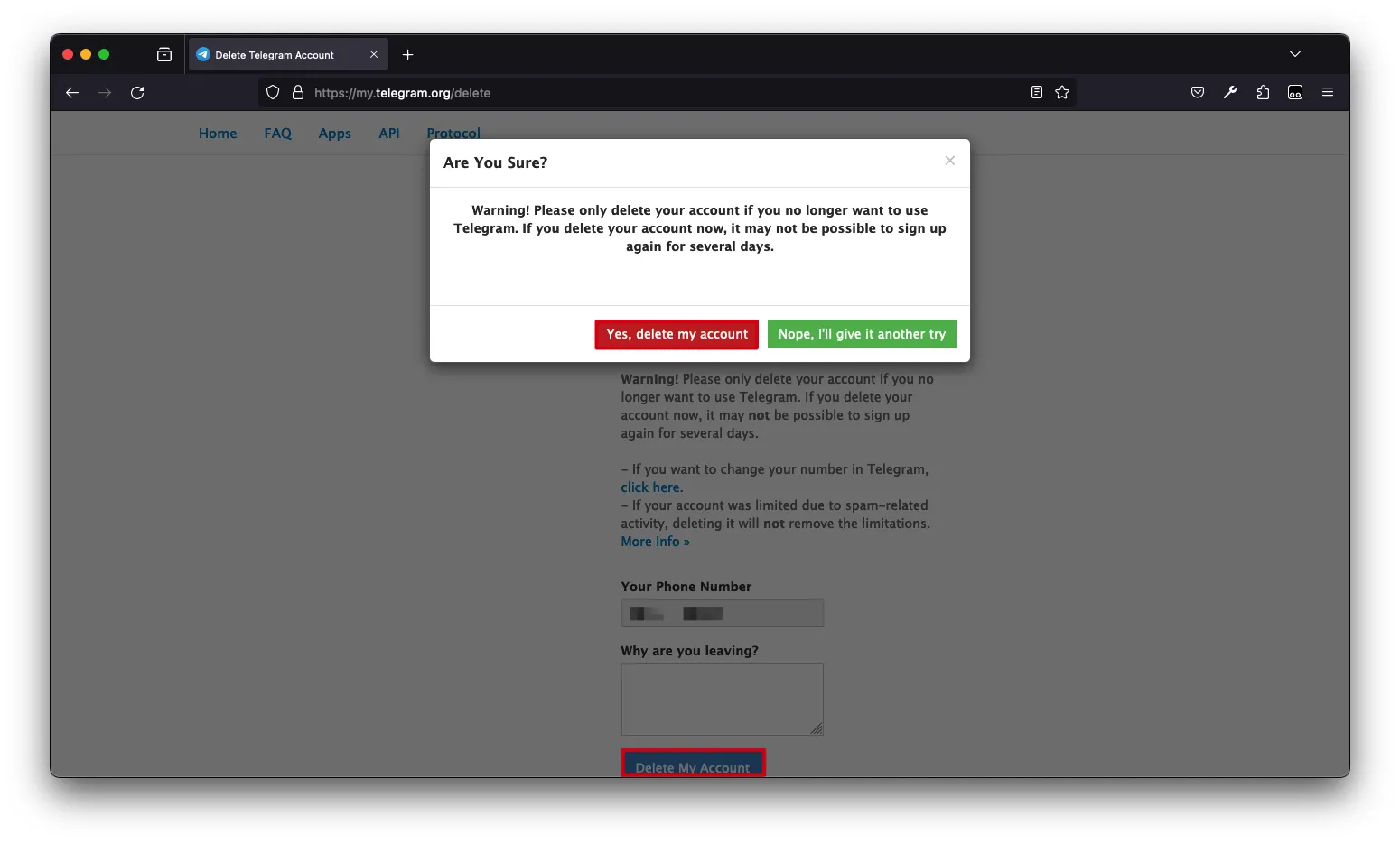 【笔记】Telegram销户 发表于 2023-10-14 更新于 2025-12-26 阅读次数: 前言Telegram销户学习笔记 Telegram销户 访问https://telegram.org/deactivate->输入包含+和区号的手机号->Next Delete account 在Telegram.app官方账号获取验证码填入文本框->Sign in 确认需要注册账号的手机号->Delete My Account->Yes, delete my account 完成参考文献知乎——E.Y
