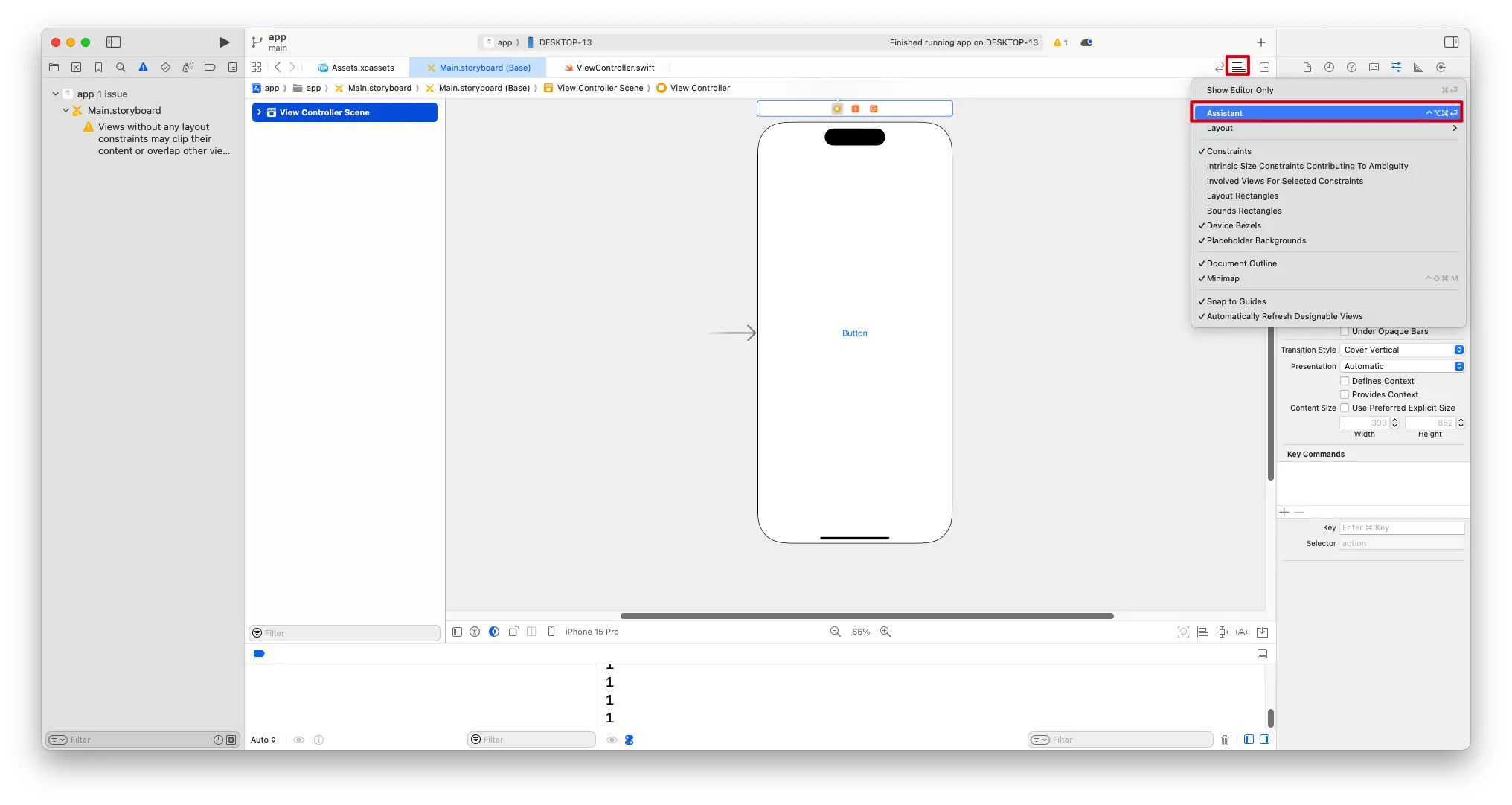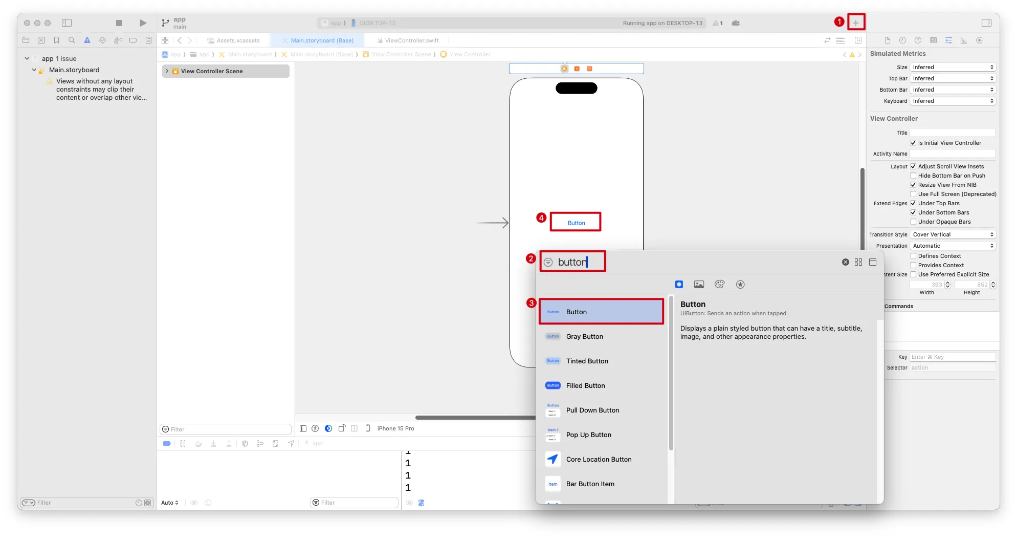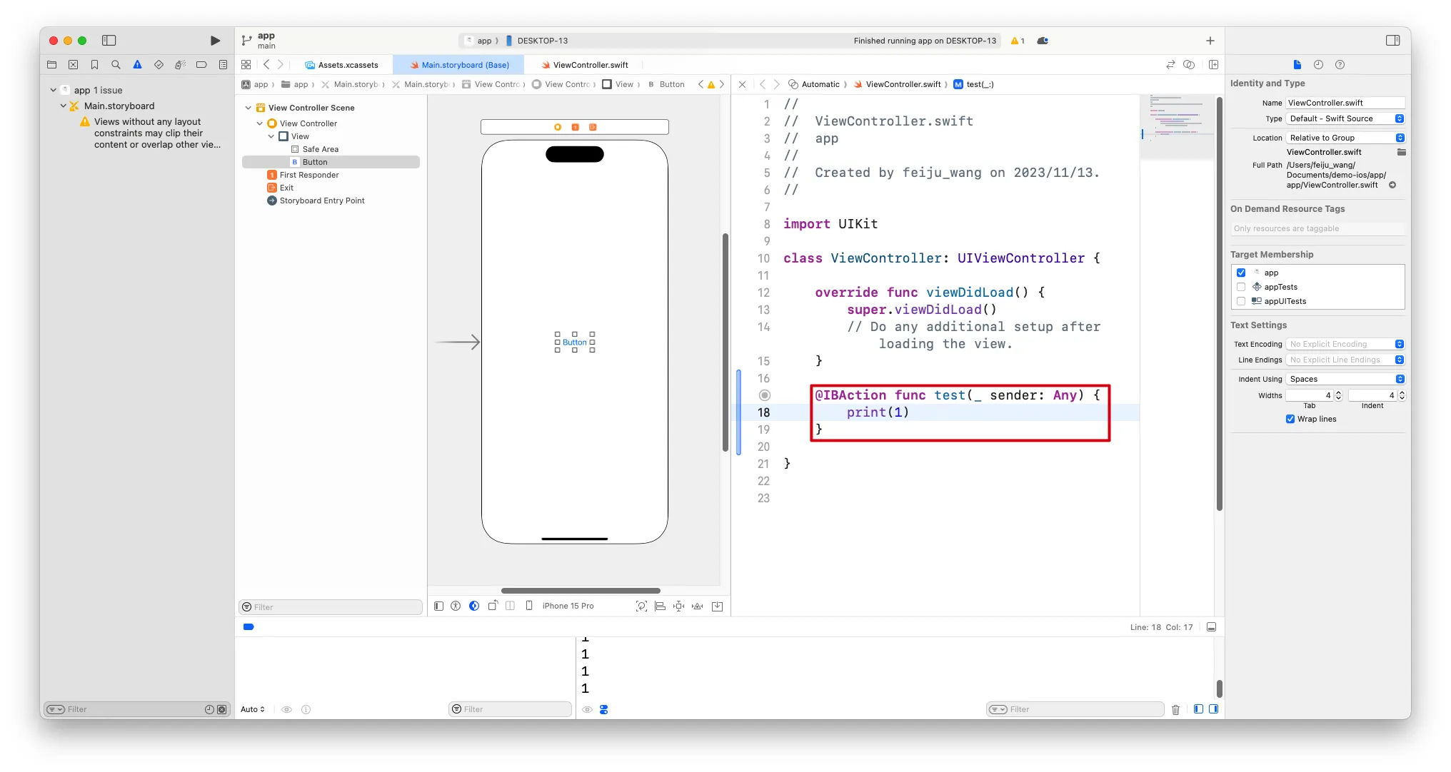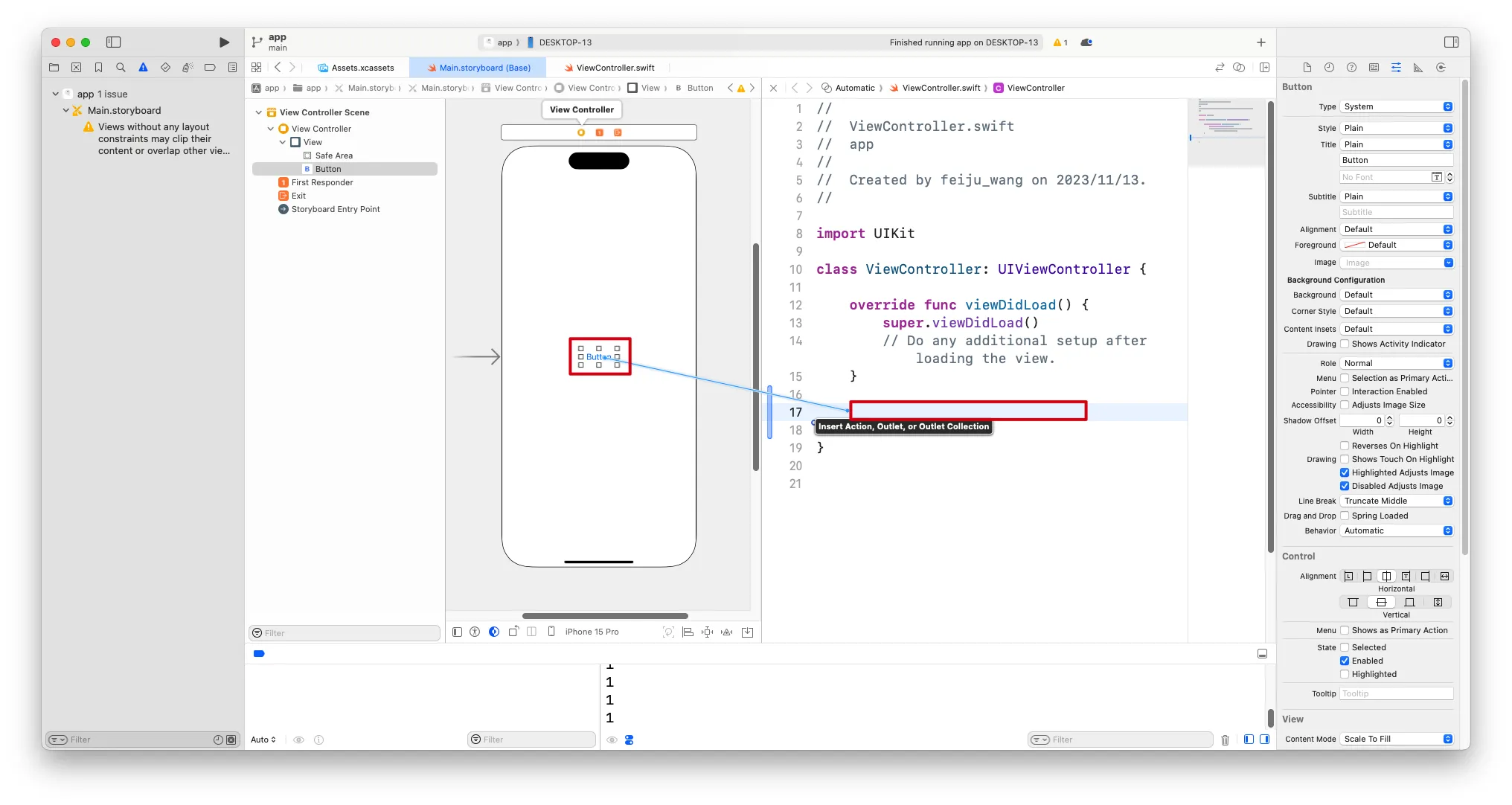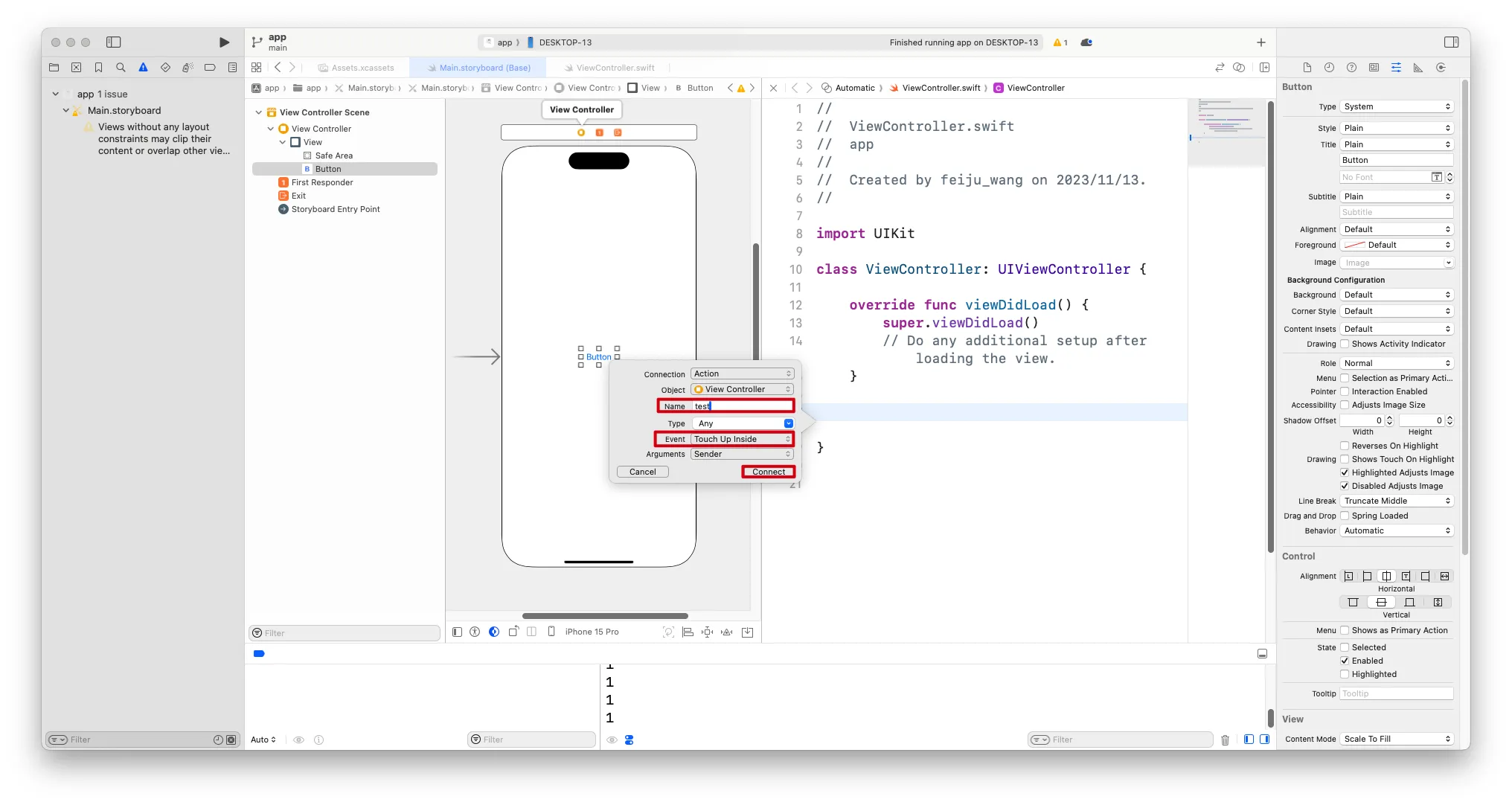 【笔记】IOS应用添加按钮并设置事件 发表于 2023-11-22 更新于 2025-12-19 分类于 Swift学习指北 阅读次数: 前言IOS应用添加按钮并设置事件 添加按钮 Main.storyboard->+->添加一个Button组件到页面中 设置事件 在Main.storyboard右上角菜单打开Assistant(Command+Option+Shift+Return),实现代码与页面联动 按住Control键,从按钮处拖拽,直至代码区 指定方法名和事件类型 在代码块内编写点击按钮触发事件后执行的代码 完成参考文献哔哩哔哩——疯狂滴小黑