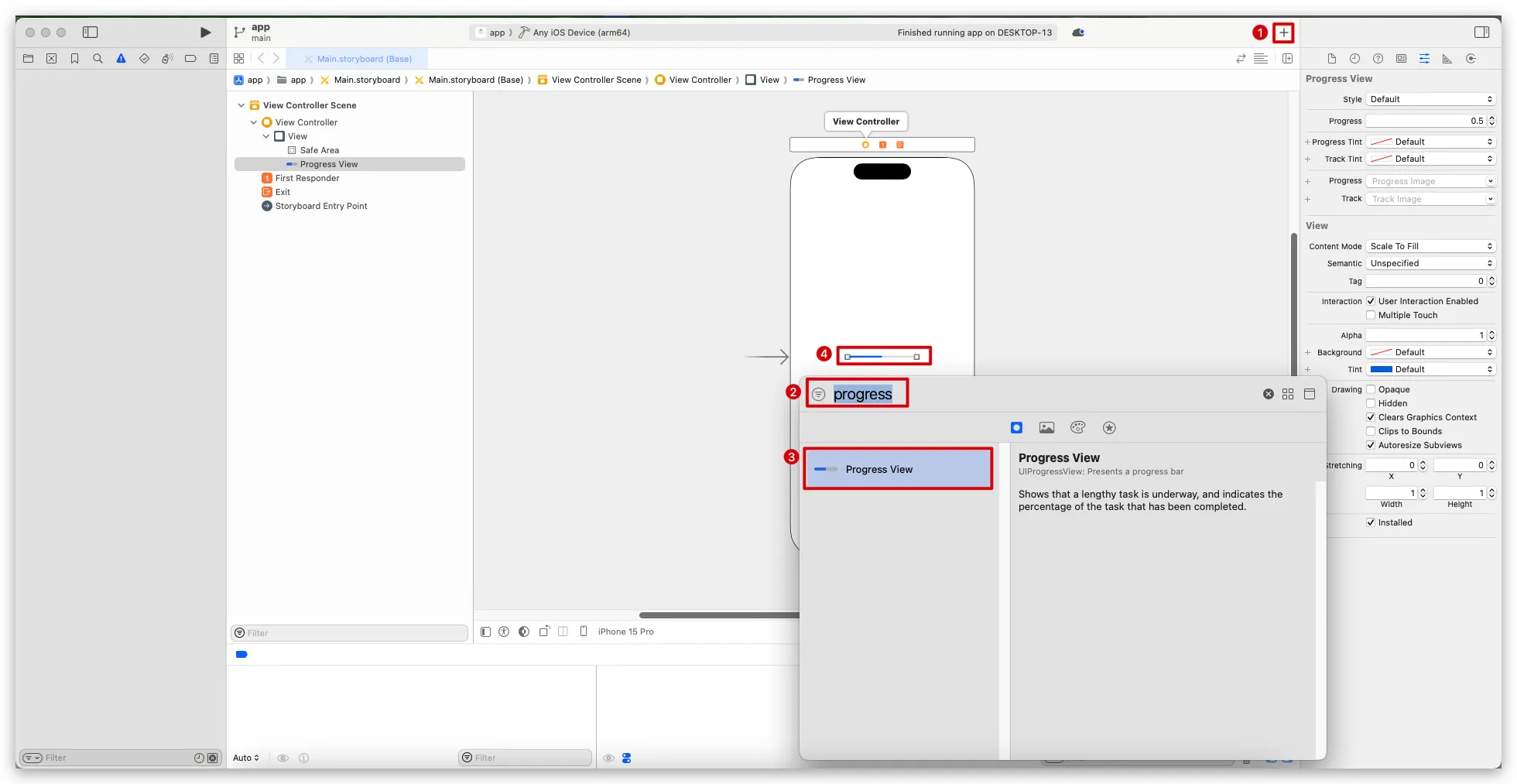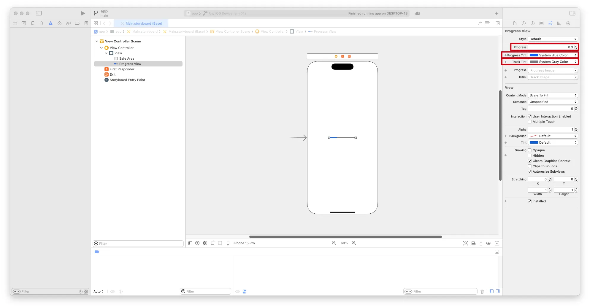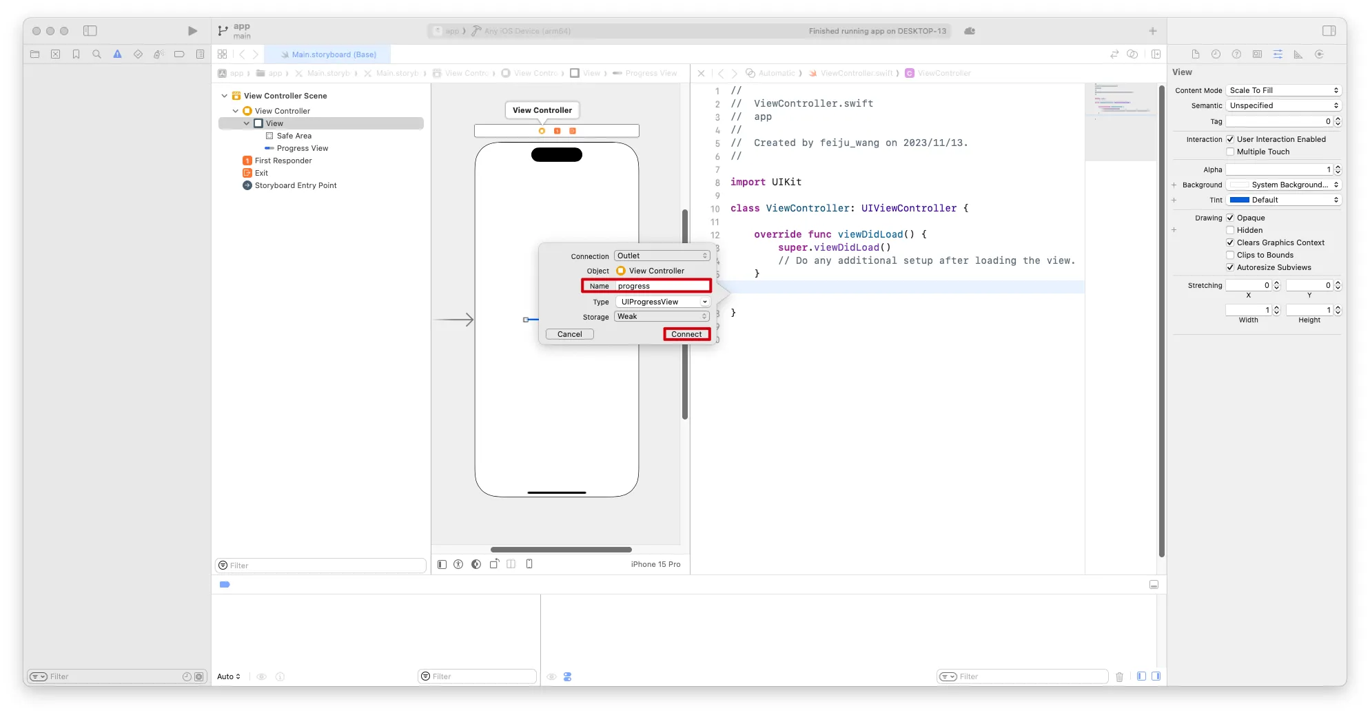 【笔记】IOS应用添加进度条并设置进度 发表于 2023-11-24 更新于 2025-12-26 分类于 Swift学习指北 阅读次数: 前言IOS应用添加进度条并设置进度 添加进度条 Show Library->搜索progress->将Progress View放到页面中 通过Progress Tint设置已完成的进度条颜色->通过Tract Tint设置未完成的进度条颜色->通过Progress设置进度,取值范围为[0,1] 将组件与代码建立连接 通过Command+Option+Control+Return打开Assistant->按住Control拖拽进度条组件到代码区 通过Name定义变量名->Connect 通过代码设置进度1progress.progress = 1.0 完成参考文献哔哩哔哩——疯狂滴小黑