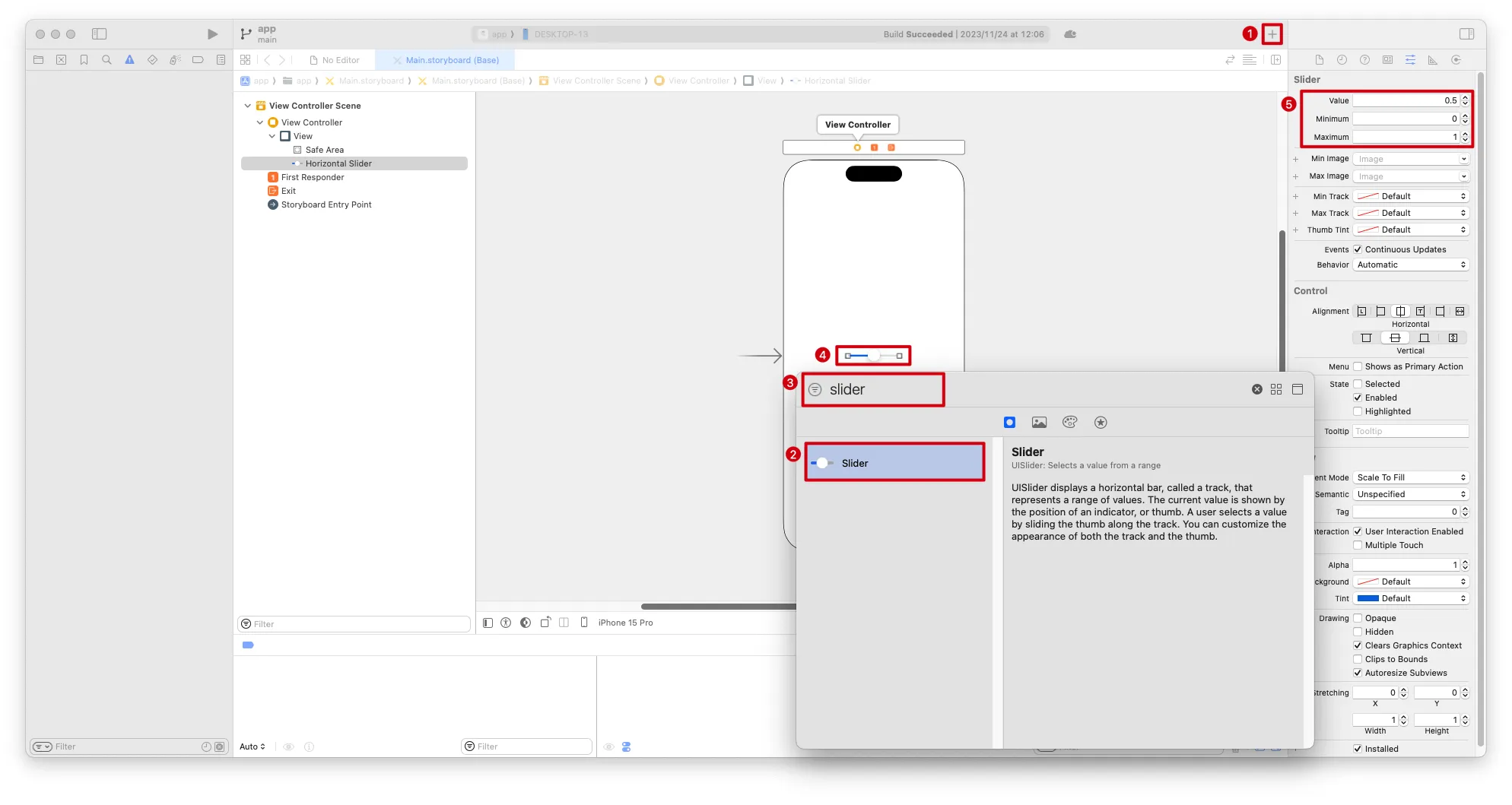 Show Library->搜索slider->将Slider放到页面中->配置当前值(Value)、最小值(Minimum)、最大值(Maximum)
