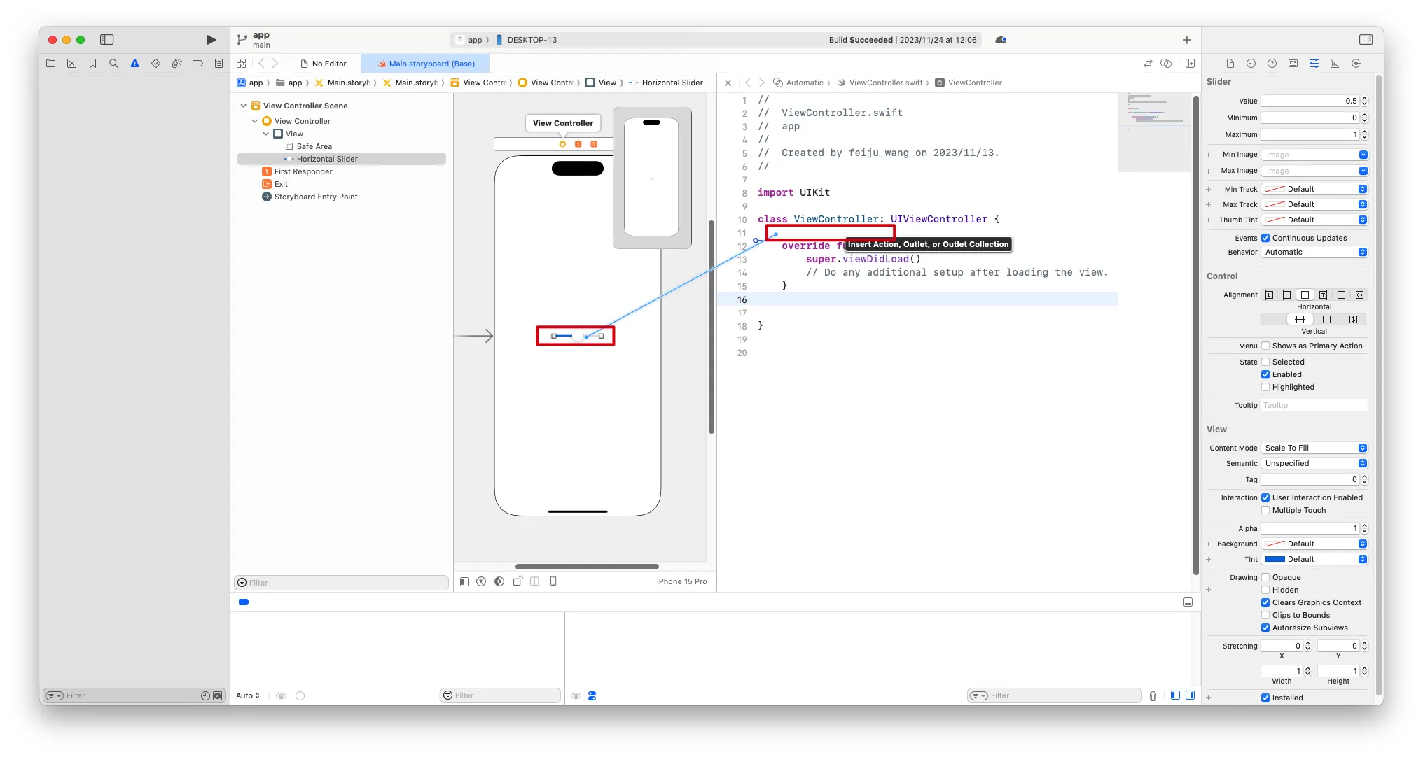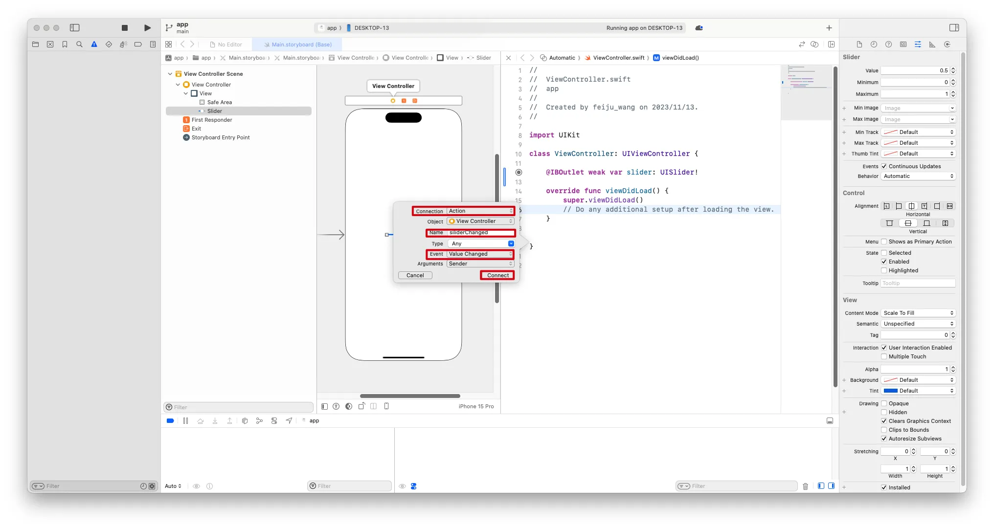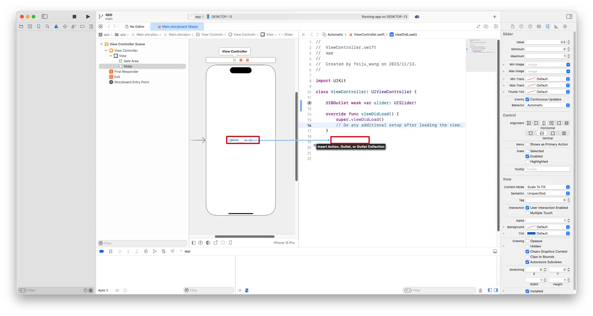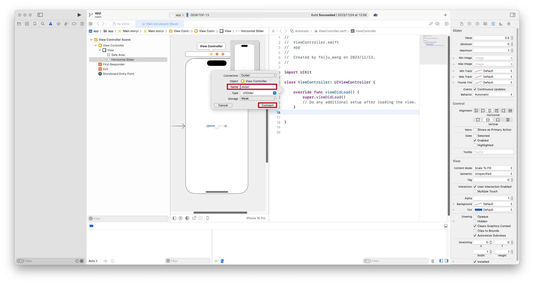 Command+Option+Control+Return打开Assistant->按住Control拖拽进度条组件到代码区