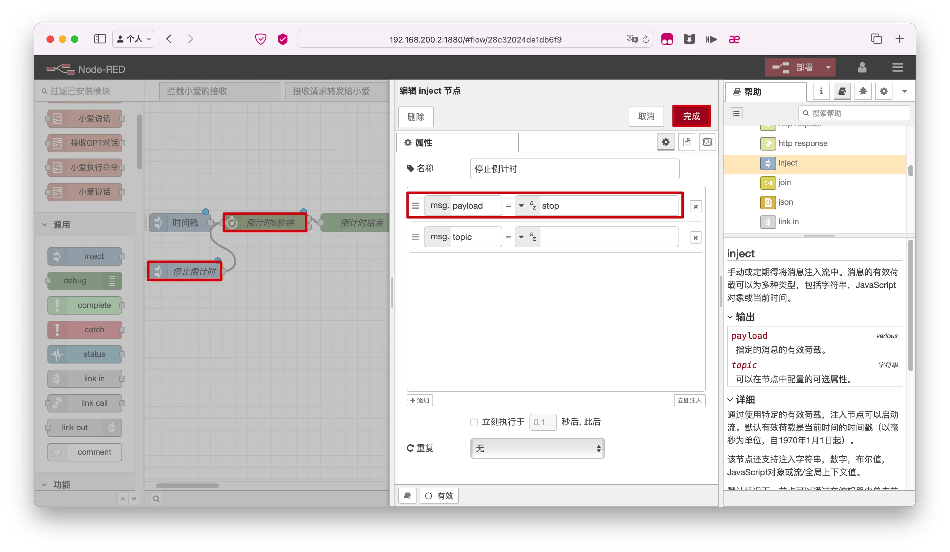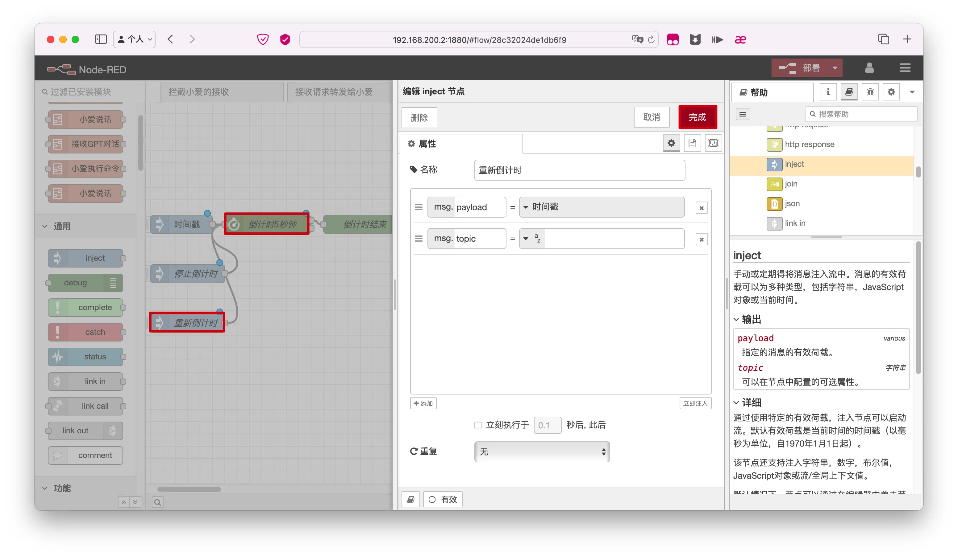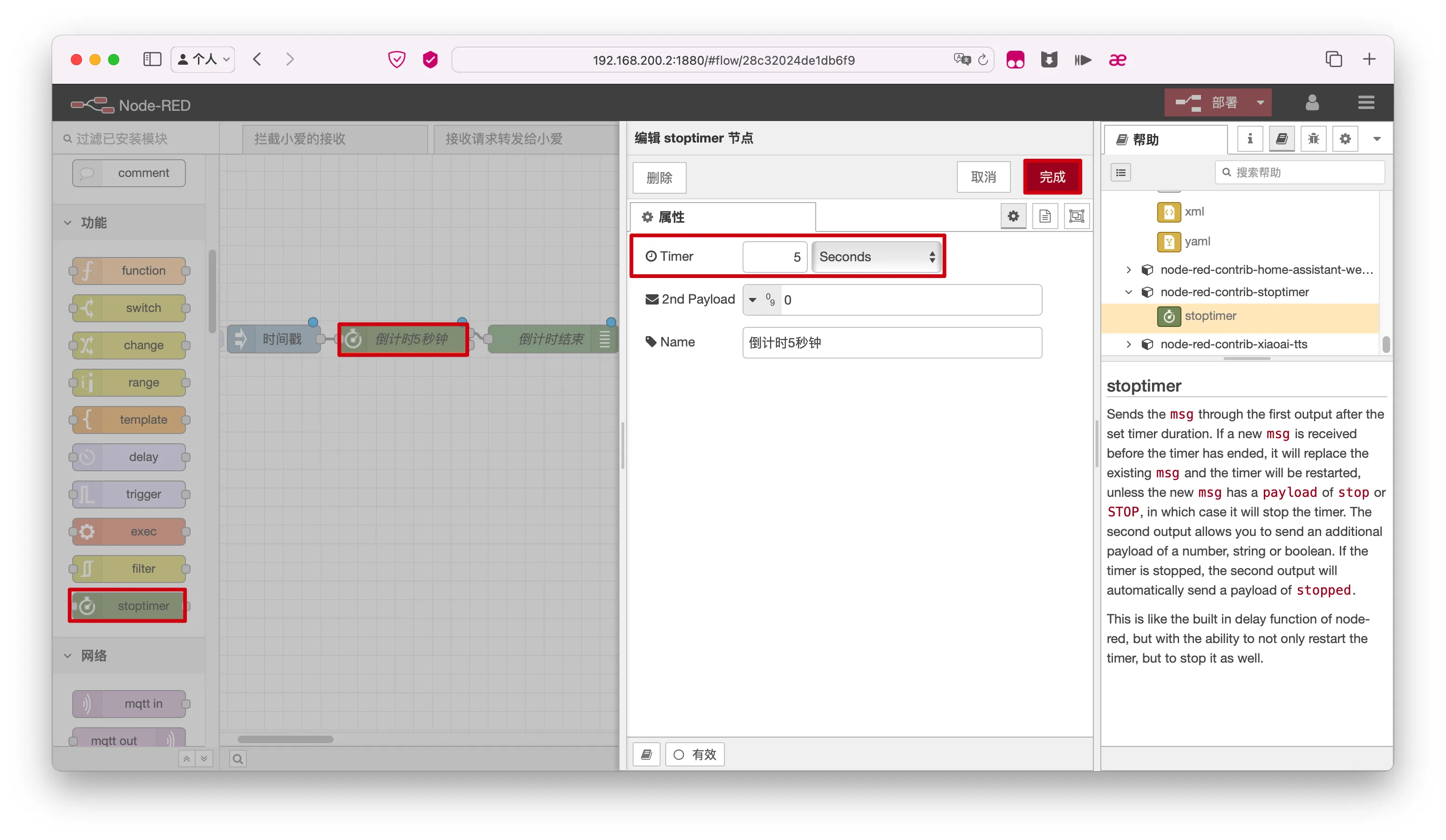 【笔记】NodeRed的计时器 发表于 2023-12-10 更新于 2025-12-12 阅读次数: 前言NodeRed的计时器 下载依赖 右上角菜单->控制板->安装->搜索并安装node-red-contrib-stoptimer模块 手动安装1npm install --no-audit --no-update-notifier --no-fund --save --save-prefix=~ --production --engine-strict node-red-contrib-stoptimer@0.0.7 触发倒计时 提前结束倒计时 终止上一次倒计时并重新倒计时 完成