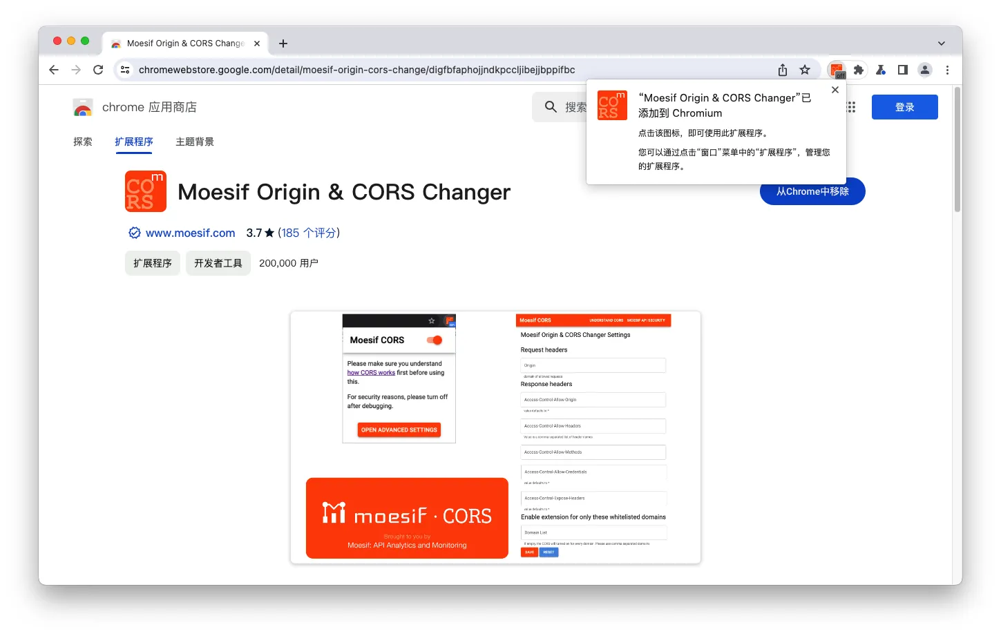 - 访问https://chrome.google.com/webstore/detail/moesif-orign-cors-changer/digfbfaphojjndkpccljibejjbppifbc->