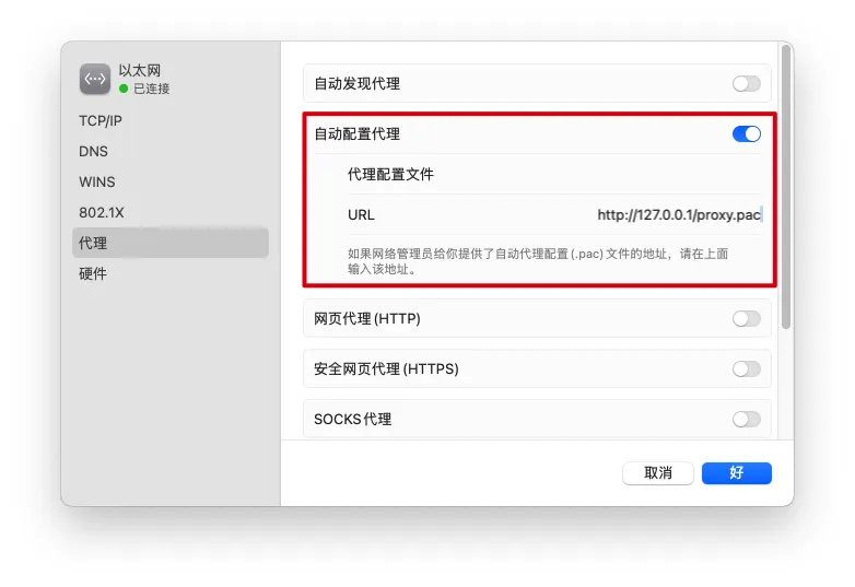 DIRECT:直连PROXY 127.0.0.1:7890:使用HTTP代理SOCKS 127.0.0.1:7891:使用SOCKS代理HTTP 127.0.0.1:7890:使用HTTP代理HTTPS 127.0.0.1:7890:使用HTTPS代理PROXY 127.0.0.1:7890; SOCKS 127.0.0.1:7891:前一个代理失效后会自动改为后一个代理PROXY 127.0.0.1:7890; DIRECT:前一个代理失效后会自动改为直连