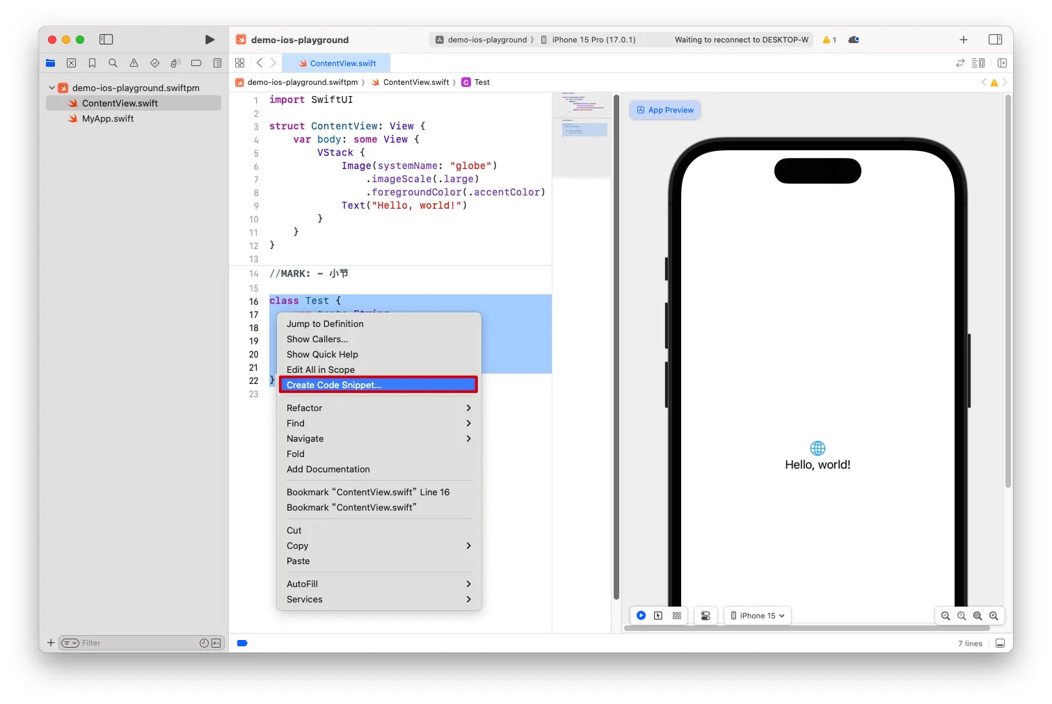 【笔记】Xcode定义代码模板 发表于 2024-01-27 更新于 2025-12-26 阅读次数: 前言Xcode定义代码模板 定义代码模板 右键一段代码->Create Code Snippet 定义标题和描述->通过<#占位符名#>定义占位符->在Completion定义提示词 调用代码模板 通过提示词可以块度生成代码 完成参考文献哔哩哔哩——疯狂滴小黑