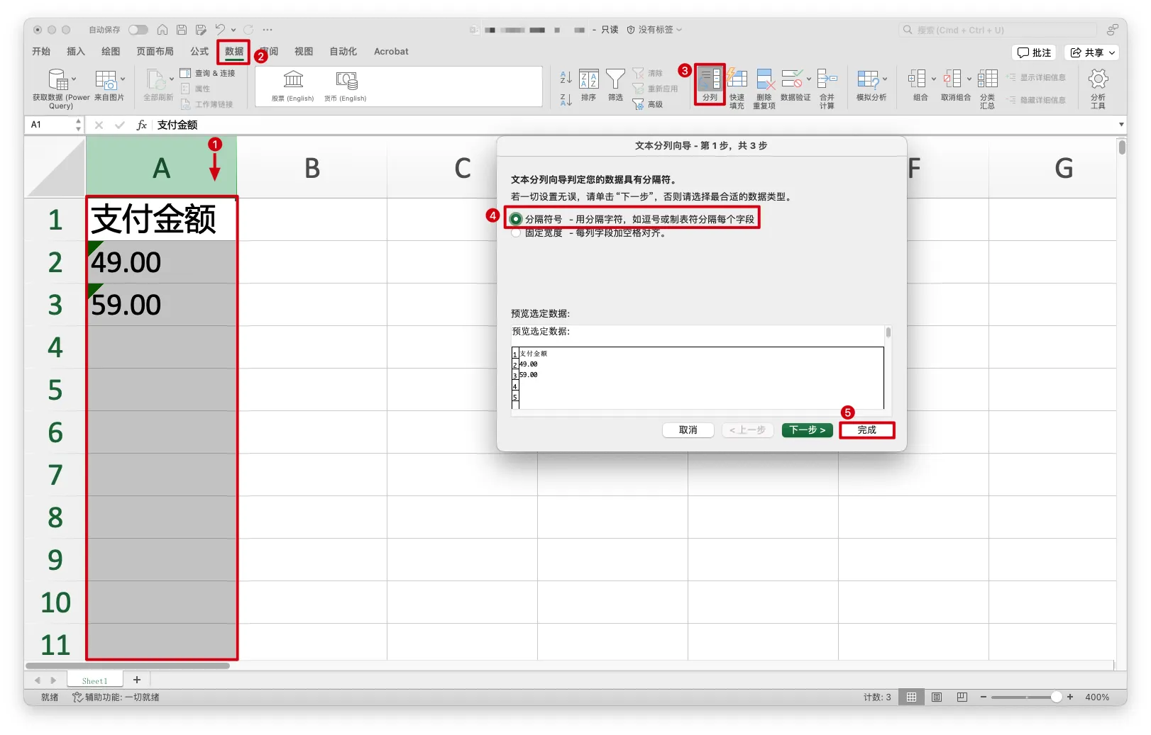 【笔记】Excel将文本形式存储的数字转换为数值类型 发表于 2024-04-16 更新于 2025-12-26 阅读次数: 前言Excel将文本形式存储的数字转换为数值类型 出现问题的原因 在Excel中,将数值型数据强制存储为字符串型数据的方式是为数值数据添加'作为前缀 如果Excel表格文件是通过代码导出的,可能所有单元格均为字符串类型数据,且没有'前缀 解决问题的原理 将前缀'从数据中分离 转换为数值类型 全选整列->数据->分列->分隔符号->完成 开始->修改单元格数据类型->数字 完成参考文献知乎——合肥红苹果财税