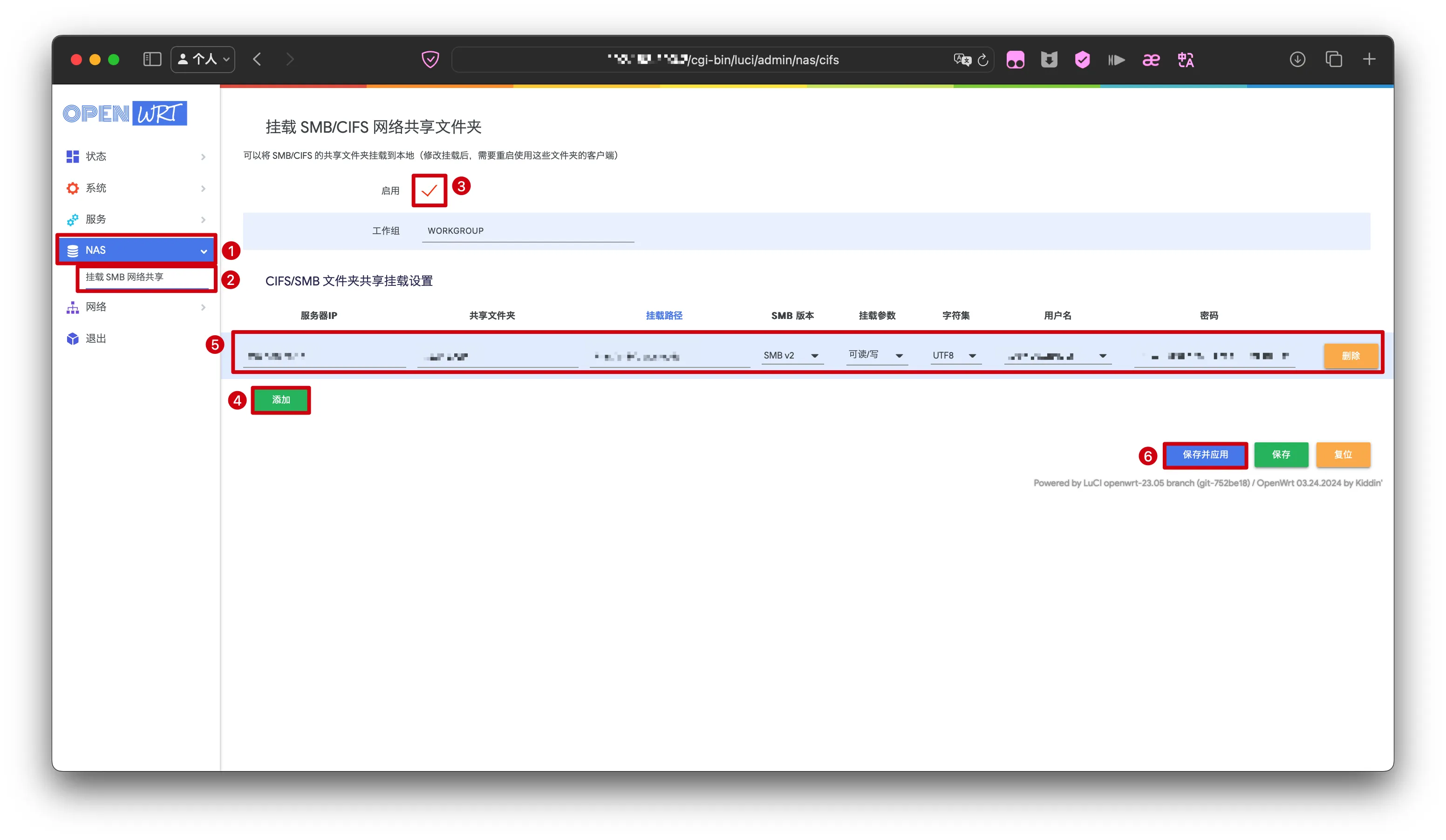 【笔记】OpenWRT挂载SMB共享文件夹 发表于 2024-05-16 更新于 2025-12-19 阅读次数: 前言OpenWRT挂载SMB共享文件夹 下载依赖1opkg install luci-app-cifs-mount 配置 NAS->挂载SMB网络共享->勾选启用->添加->添加配置->保存并应用 完成参考文献哔哩哔哩——韩风Talk