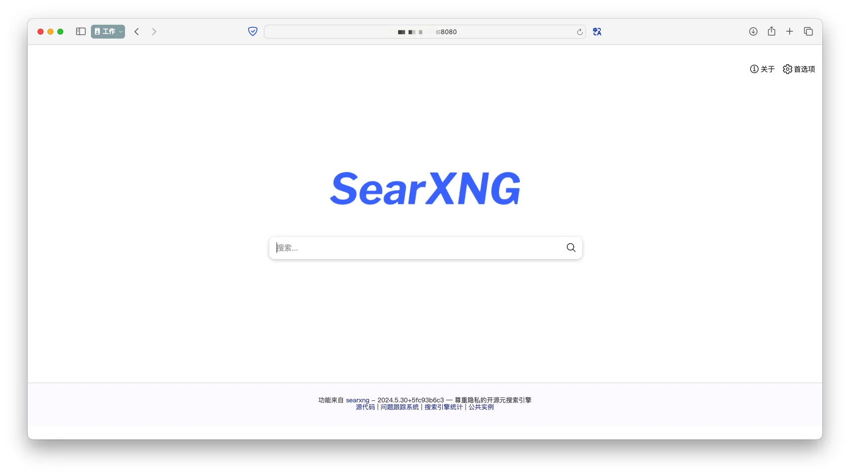 【笔记】通过Docker部署SearXNG 发表于 2024-05-31 更新于 2025-12-26 阅读次数: 前言通过Docker部署SearXNG,实现聚合搜索引擎 通过Docker部署1docker run -d --name searxng -p 8080:8080 searxng/searxng:latest 完成 截图纪念 参考文献哔哩哔哩——锤子V君