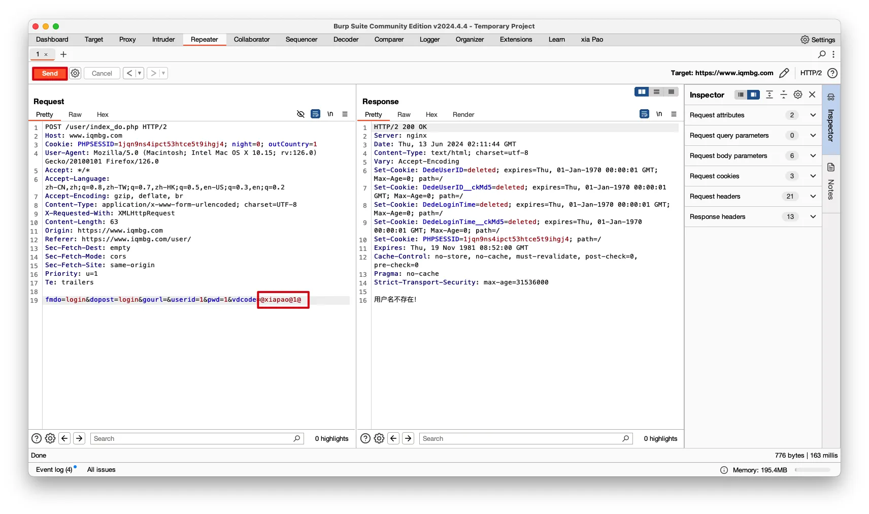 Intruder或Repeater中修改验证码值为占位符@xiapao@1@->Send