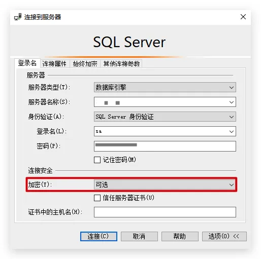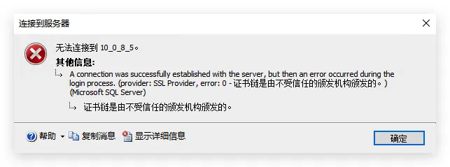 【踩坑】MicrosoftSQLServerManagerStudio连接数据库时报错 发表于 2024-08-19 更新于 2025-12-26 阅读次数: 前言MicrosoftSQLServerManagerStudio连接数据库时报错:证书链是由不受信任的颁发机构颁发的。 原因 加密选项选择为强制,但是服务器未加密 解决问题 连接时加密选项选择为可选 完成参考文献CSDN——吴光亮