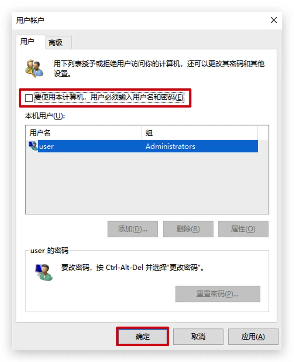 netplwiz->用户->取消勾选要使用本计算机,用户必须输入用户名和密码->确定