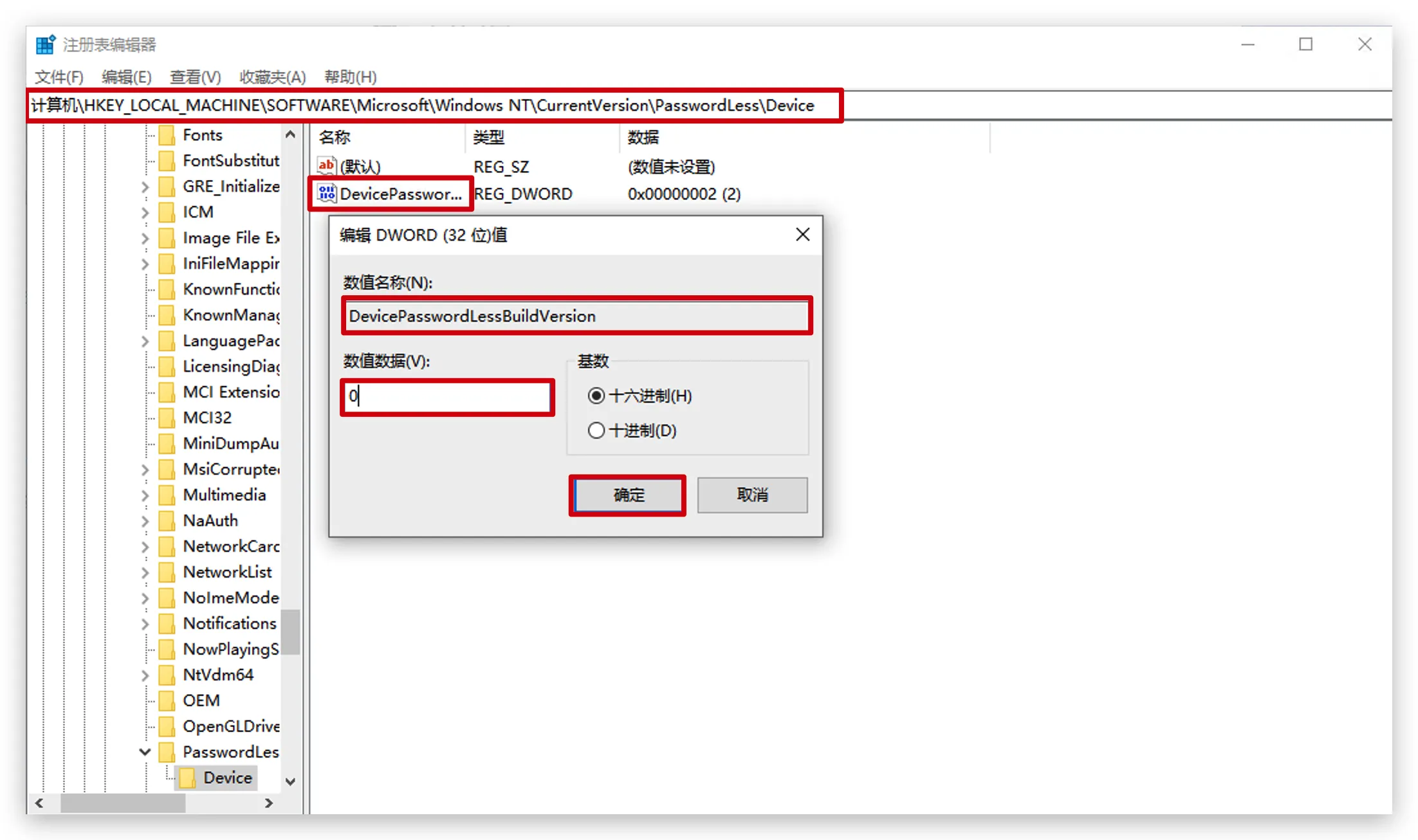 regedit注册表编辑器->HKEY_LOCAL_MACHINE\SOFTWARE\Microsoft\Windows NT\CurrentVersion\PasswordLess\Device->修改值DevicePasswordLessBuildVersion的数据从十六进制的2改为0->确定