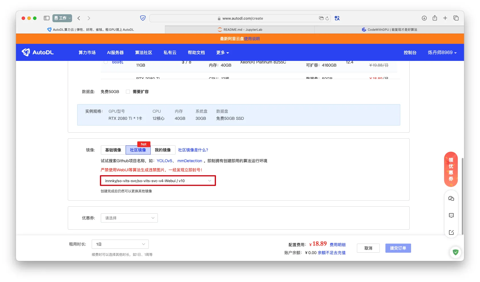 容器实例->镜像选择社区镜像->innnky/so-vits-svc/so-vits-svc-v4-Webui / v10