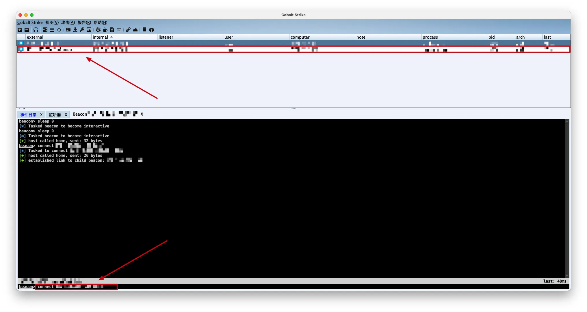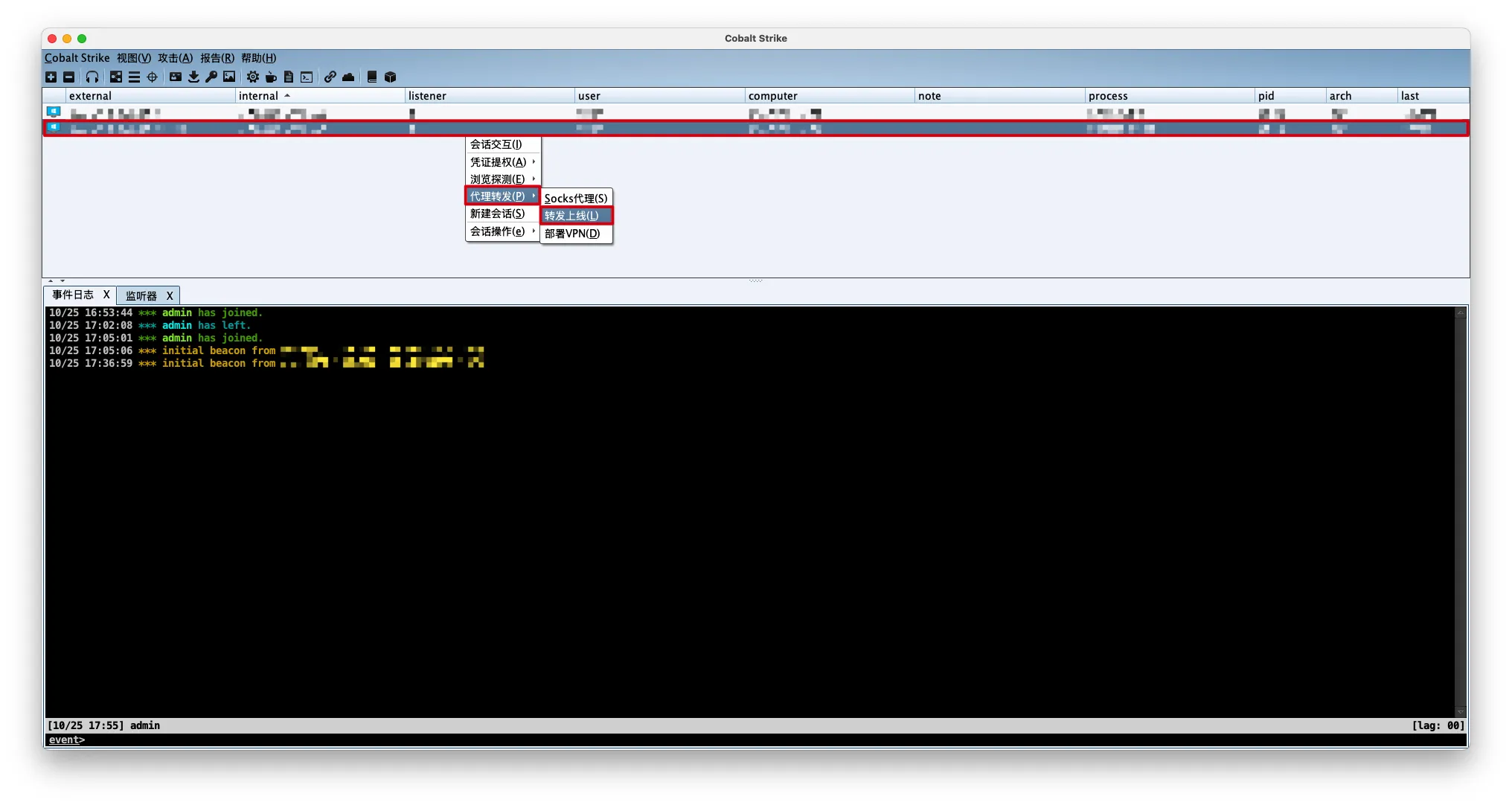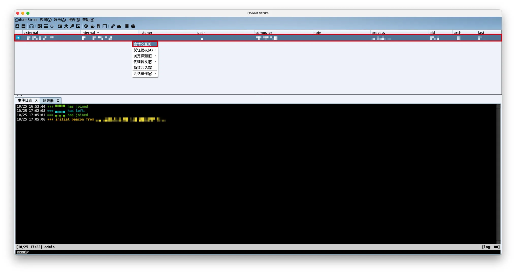 - 受害者执行木马,会主动连接CobaltStrike服务端,上线成功后,攻击者可以看到新的会话