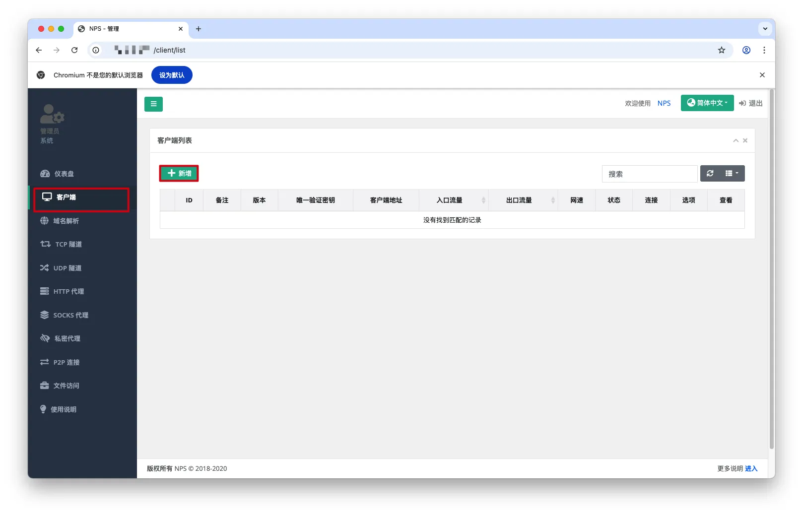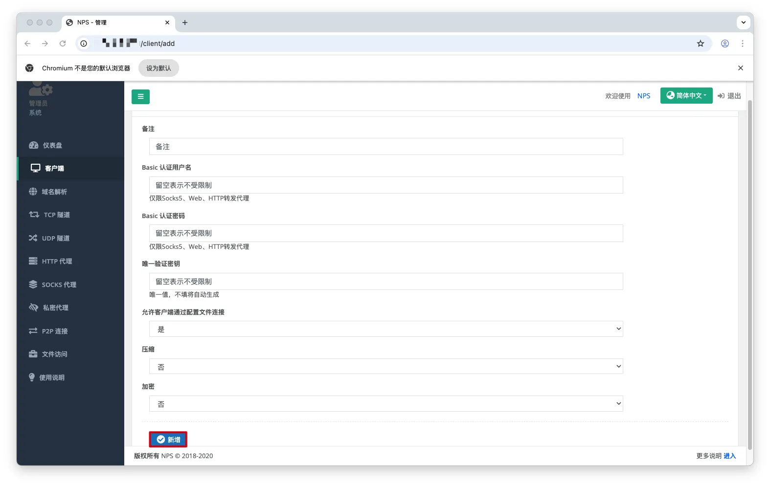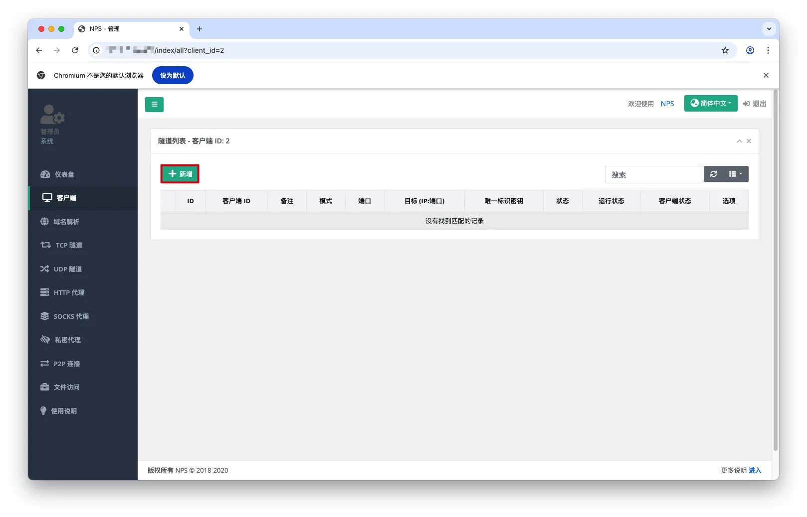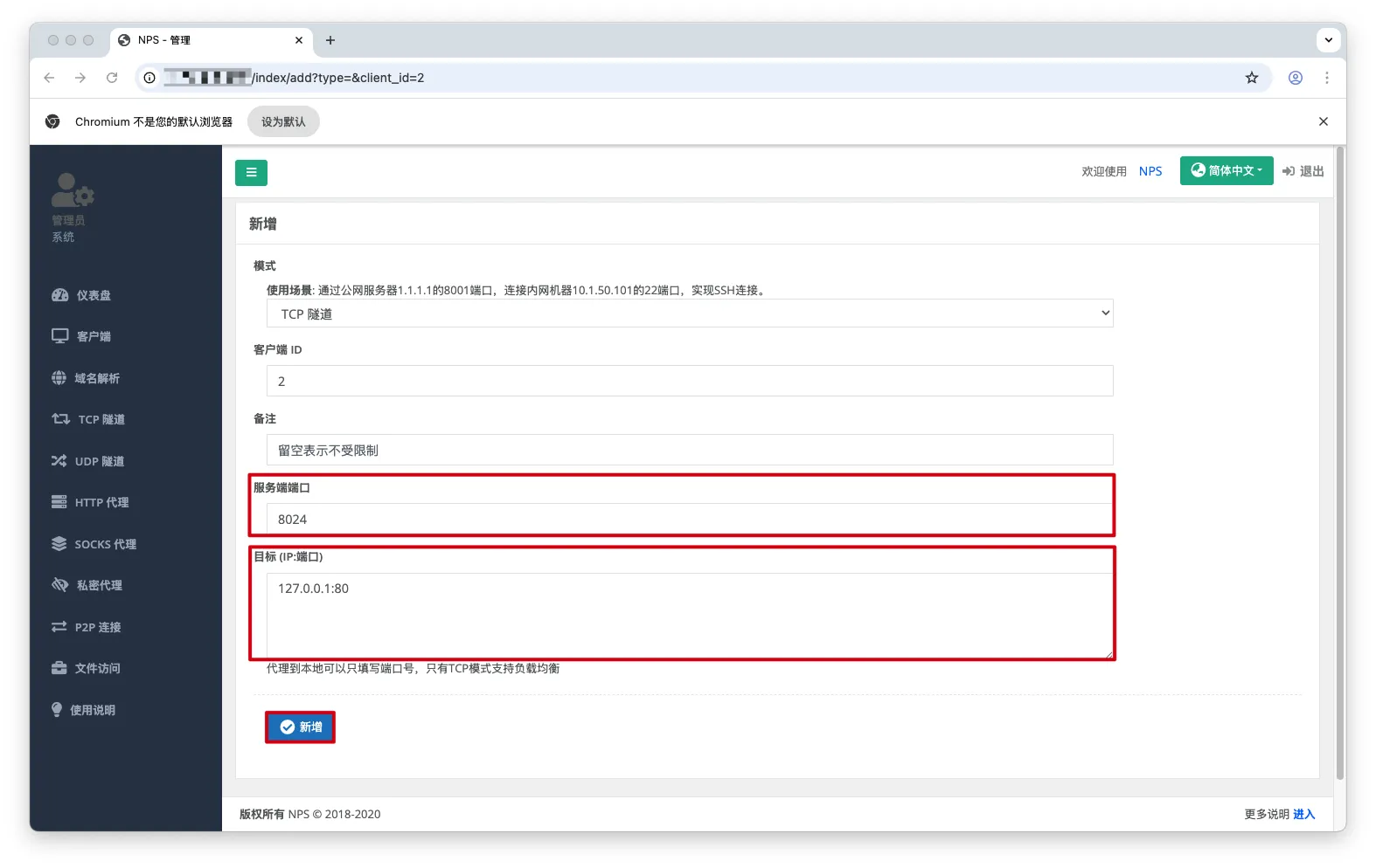 服务端端口配置为映射后的在服务端的端口,目标(IP:端口)配置为在客户端启动时其内网的需要映射到服务端指定端口的服务->新增