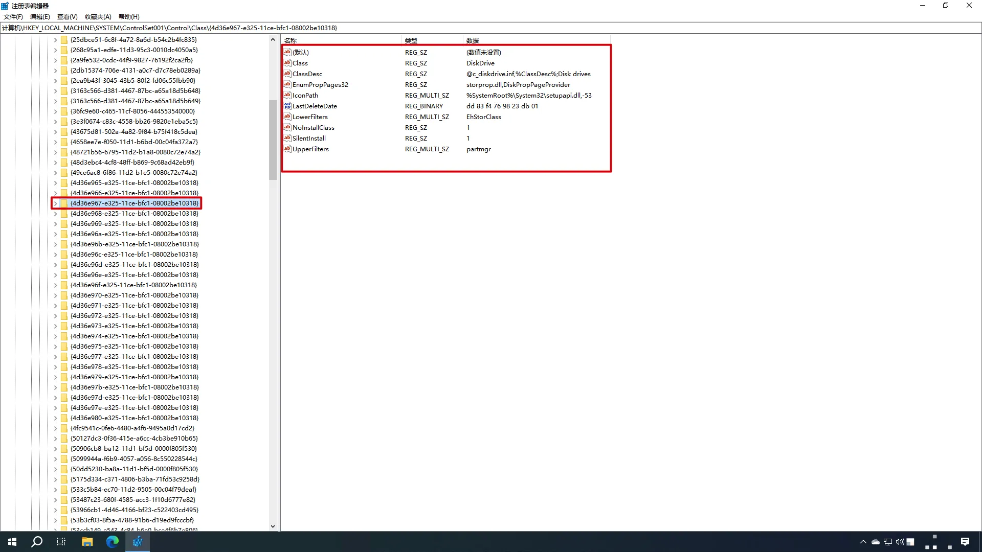 HKEY_LOCAL_MACHINE\SYSTEM\ControlSet001\Control\Class\{4d36e967-e325-11ce-bfc1-08002be10318}的值以修复磁盘配置