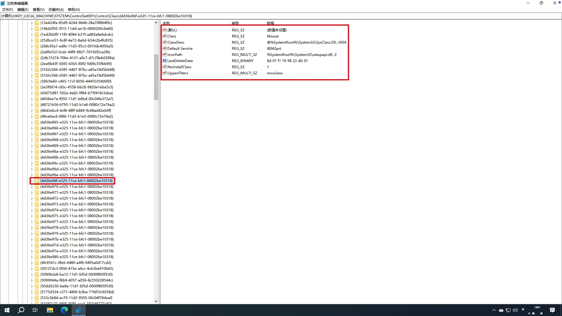 HKEY_LOCAL_MACHINE\SYSTEM\ControlSet001\Control\Class\{4d36e96f-e325-11ce-bfc1-08002be10318}的值以修复鼠标配置
