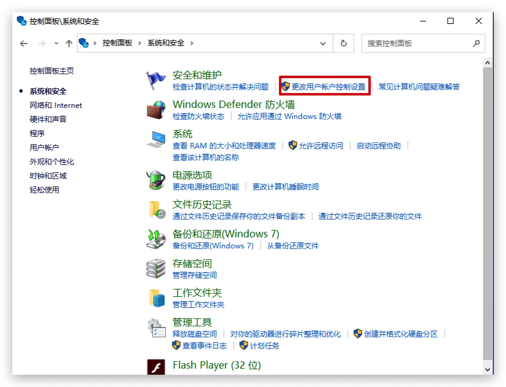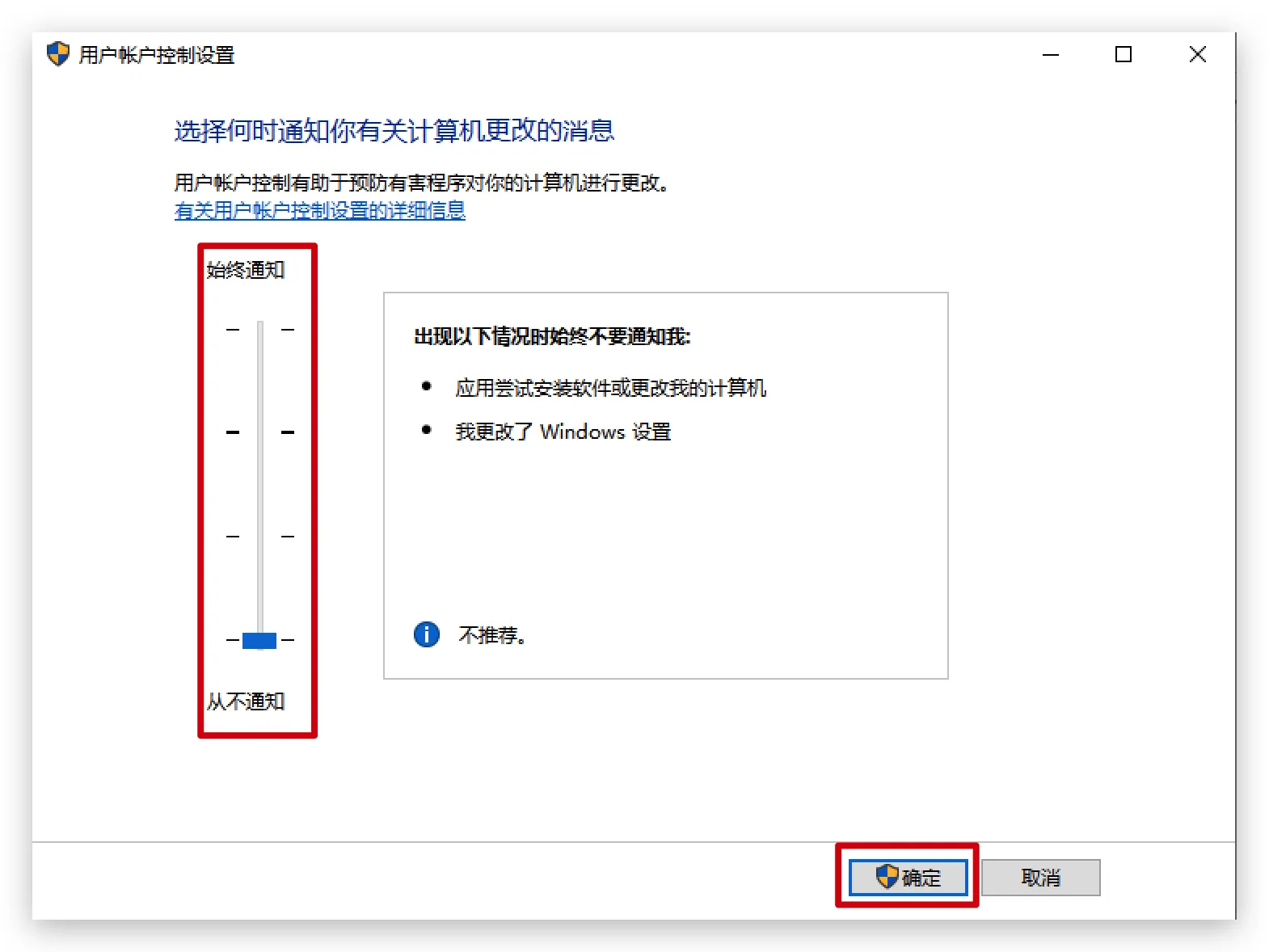 - 将安全度调到最低(拖拽滑块到最底端)->