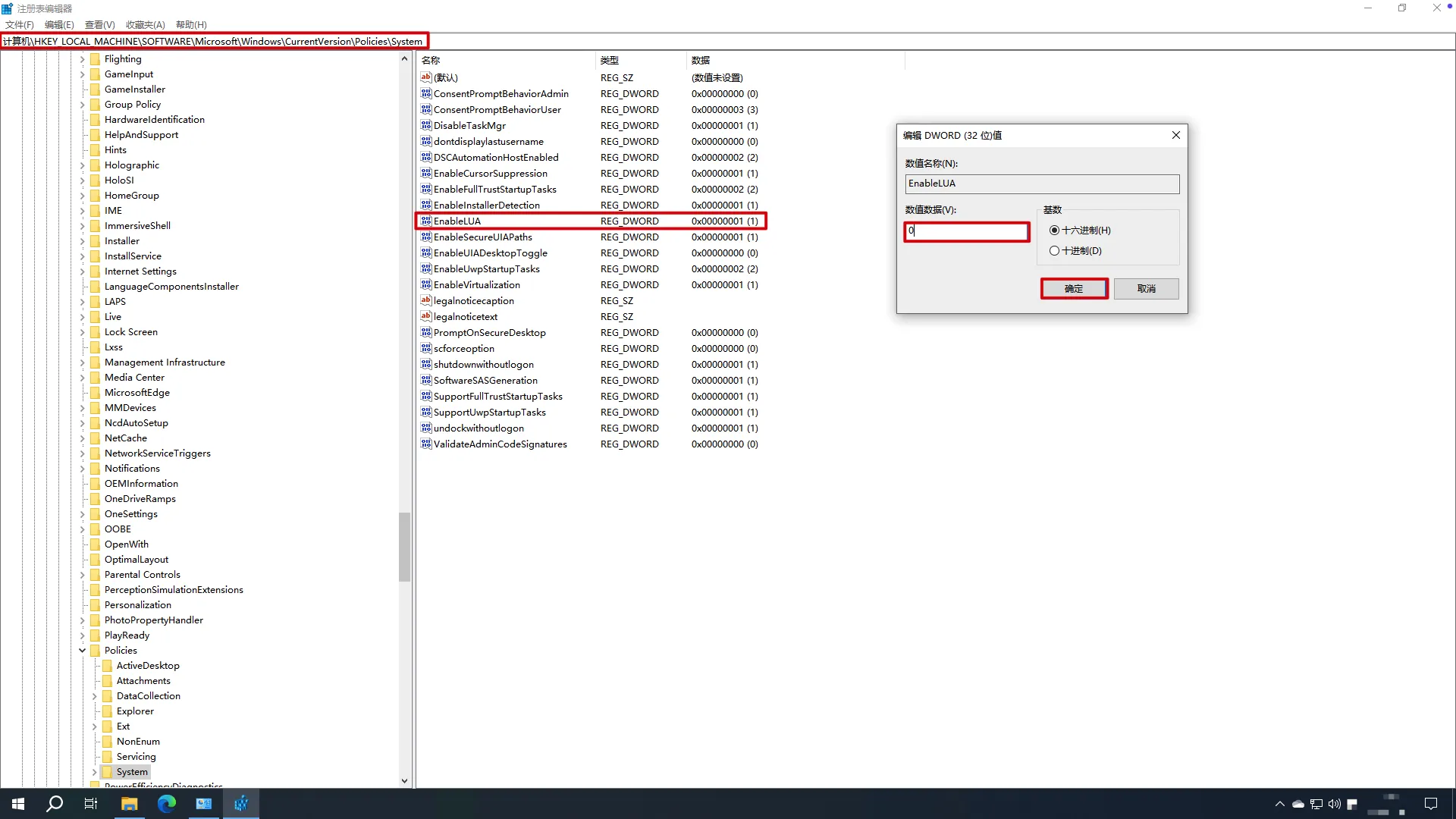 HKEY_LOCAL_MACHINE\SOFTWARE\Microsoft\Windows\CurrentVersion\Policies\System修改值EnableLUA数据为0