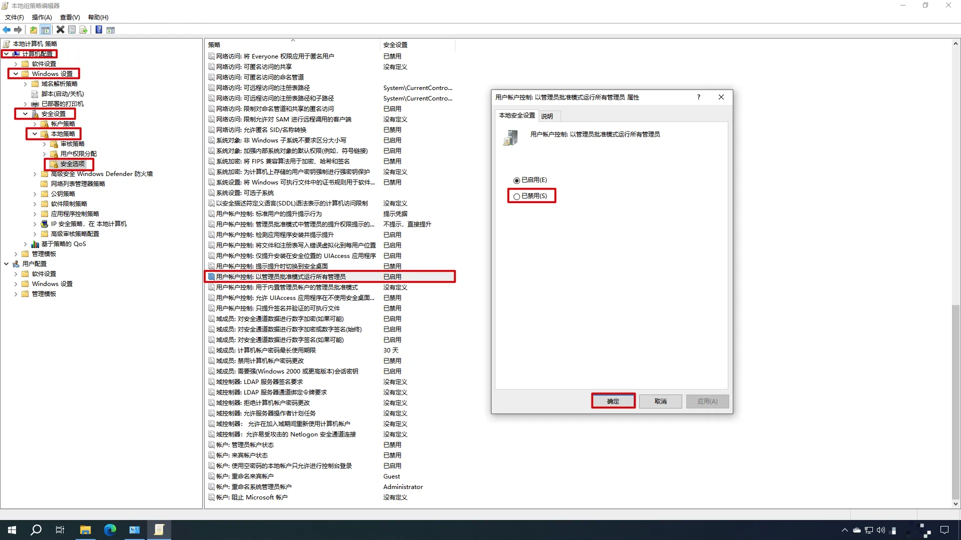 计算机配置->Windows设置->安全设置->本地策略->安全选项->用户账户控制:以管理员批准模式运行所有管理员修改为已禁用->确定