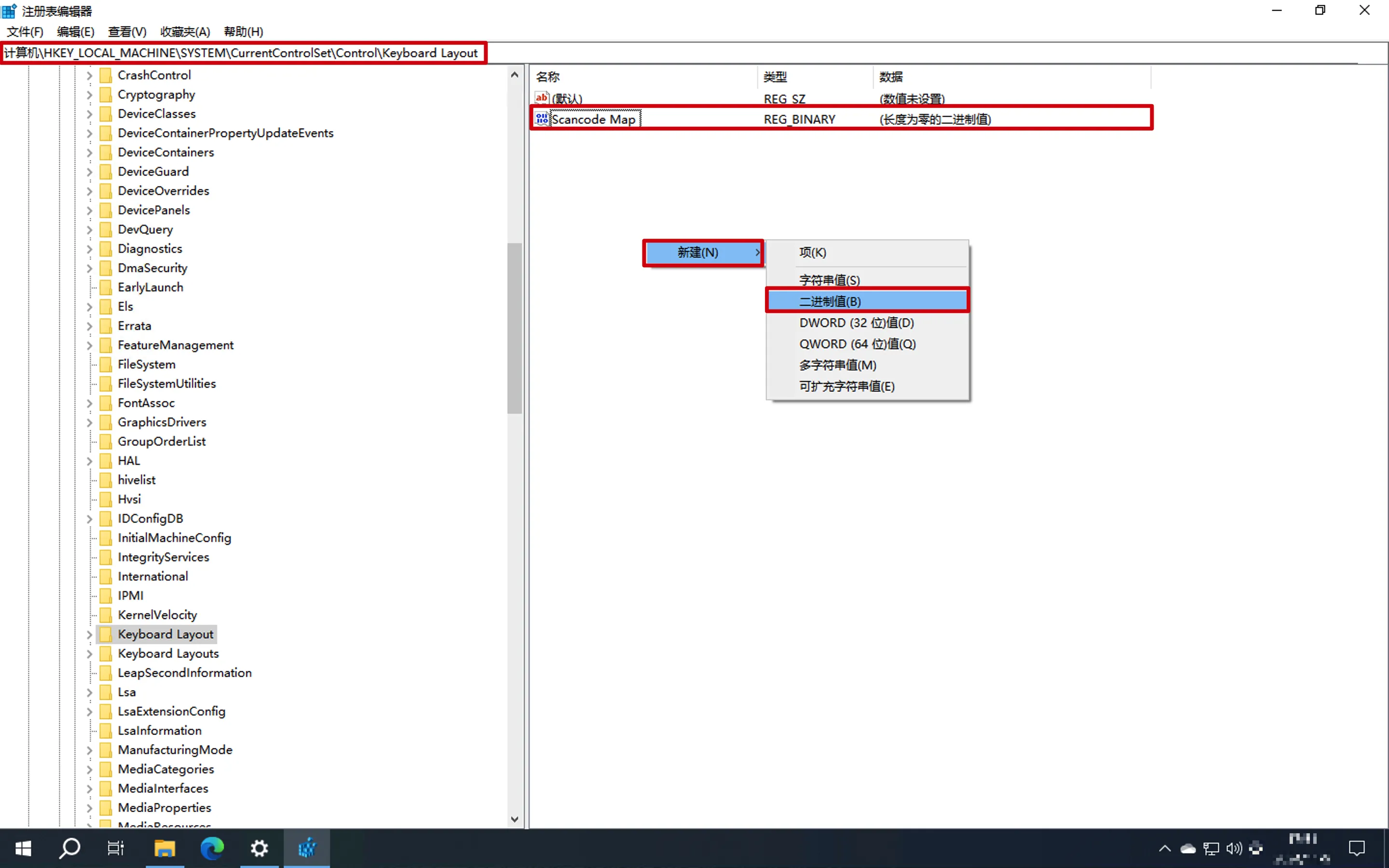 regedit打开注册表编辑器->HKEY_LOCAL_MACHINE\SYSTEM\CurrentControlSet\Control\Keyboard Layout新建二进制值Scancode Map