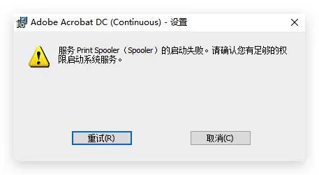 【踩坑】Windows安装AdobeAcrobatProDC时报错 发表于 2024-11-16 更新于 2025-12-26 阅读次数: 前言Windows安装AdobeAcrobatProDC时报错:服务 Print Spooler(Spooler)的启动失败。请确定您有足够的权限启动系统服务。 解决问题 运行services.msc打开服务->双击Print Spooler->启动类型改为手动->应用->启动->确定 完成参考文献CSDN——Smile_Joe