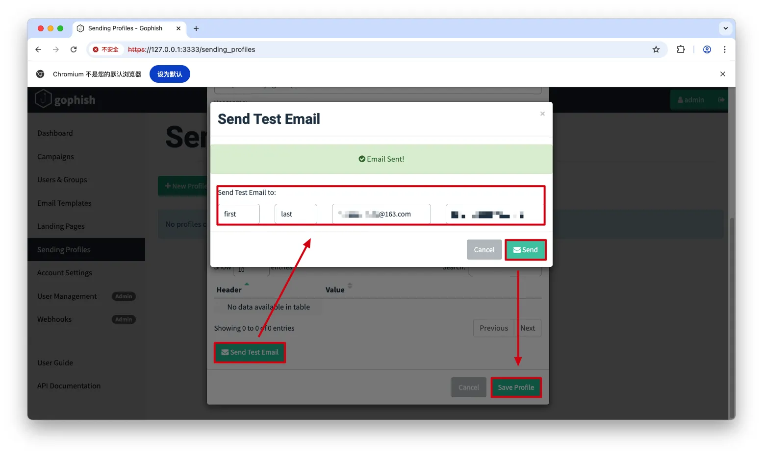 Send Test Email->填写发送给测试邮箱的配置->Send->Save Profile