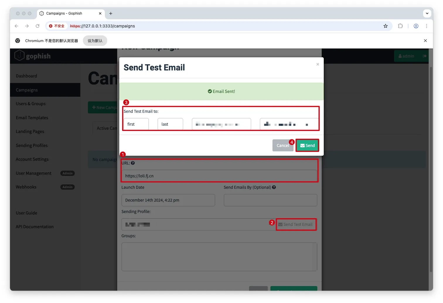 URL用于定义跳转的目标->Send Test Email->填写发送给测试邮箱的配置->Send