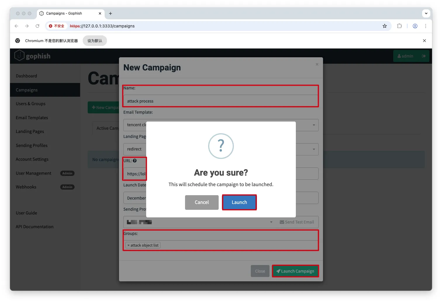 Name->填写URL用于定义跳转的目标->选择上一步骤定义的目标列表->Launch Campaign->Launch