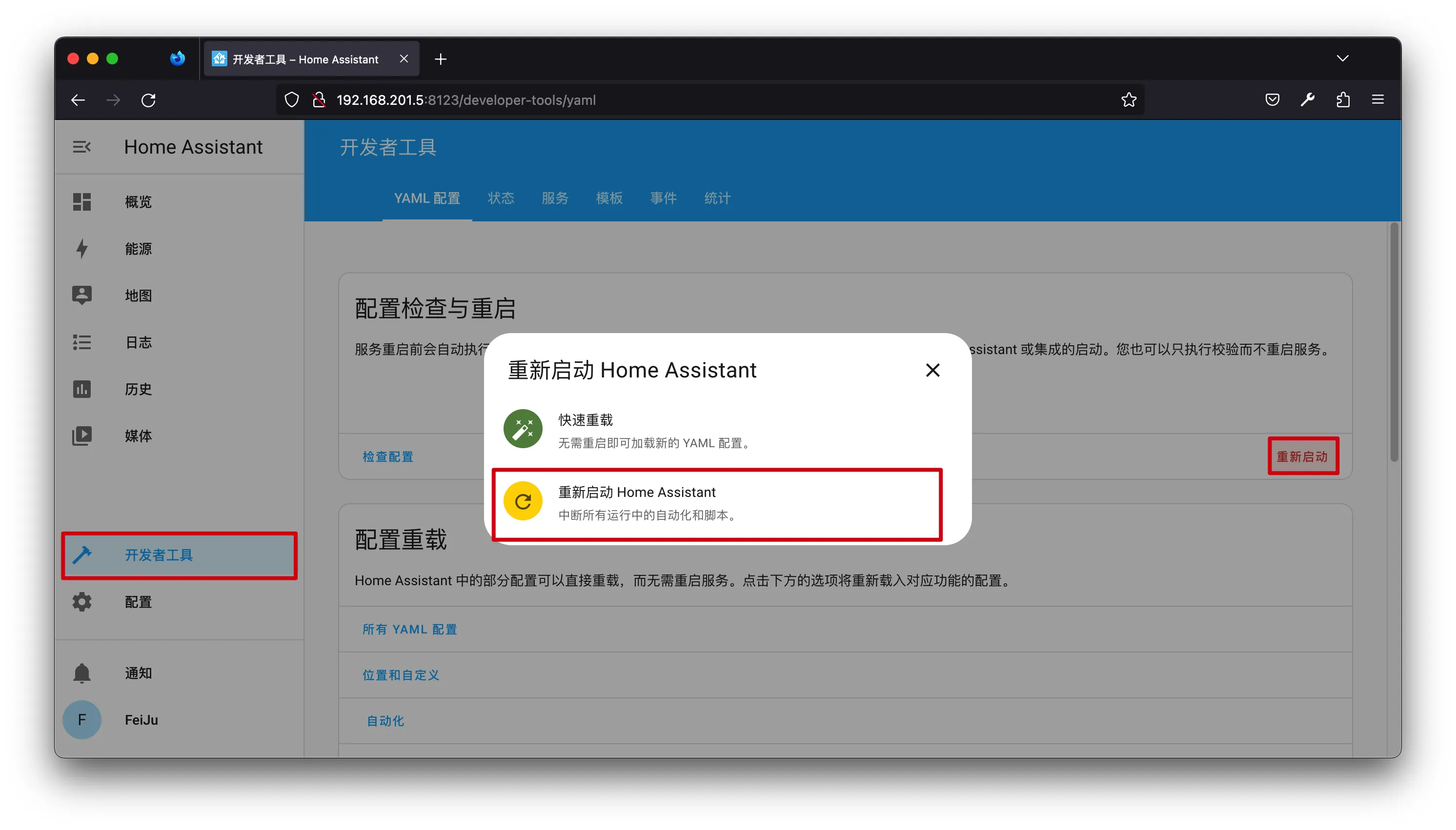 开发者工具->重新启动->重新启动 Home Assistant