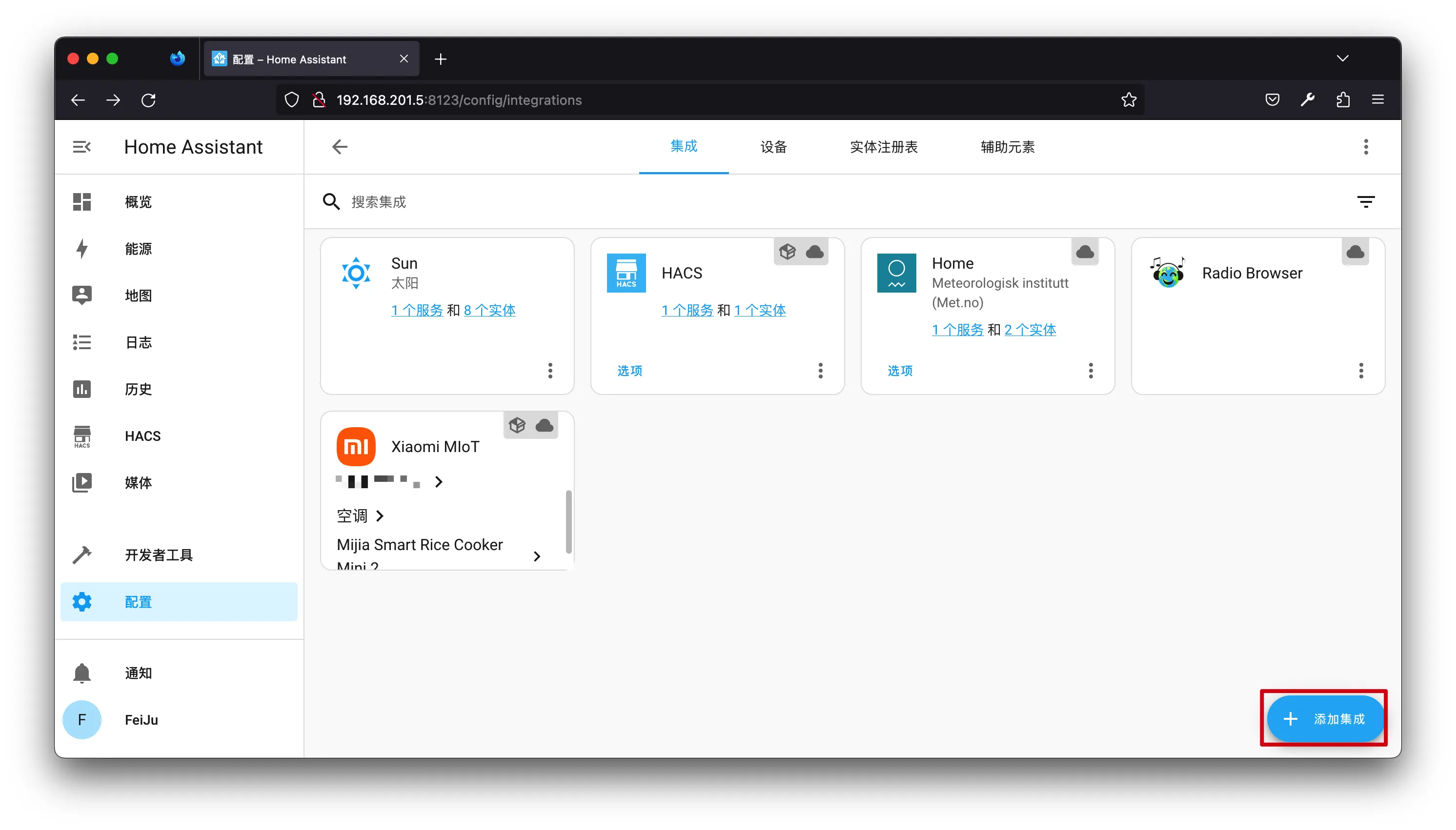 配置->设备与服务->集成->添加集成