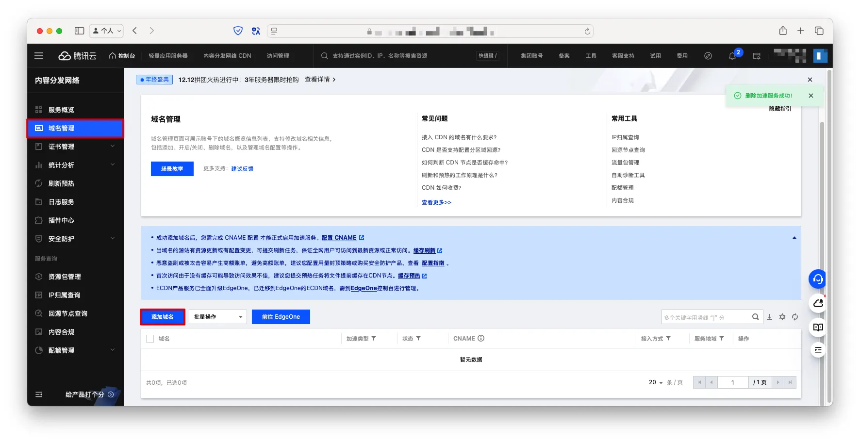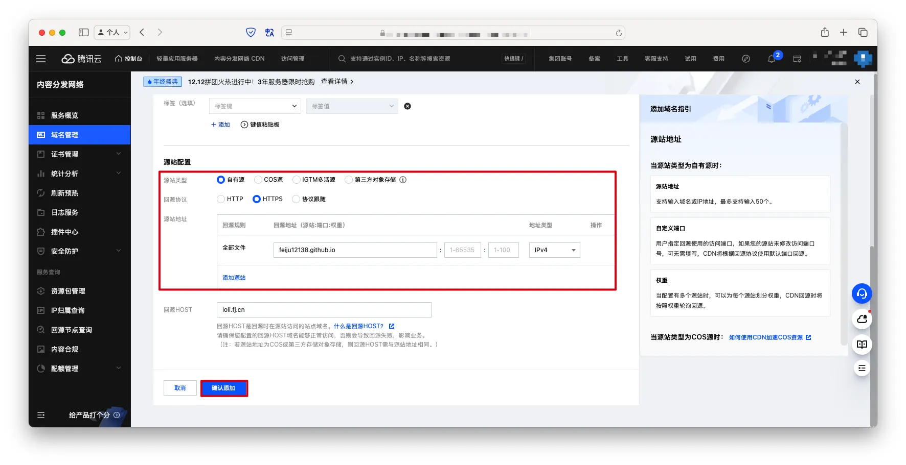 源站地址填写需要加速的域名实际资源域名->确认添加