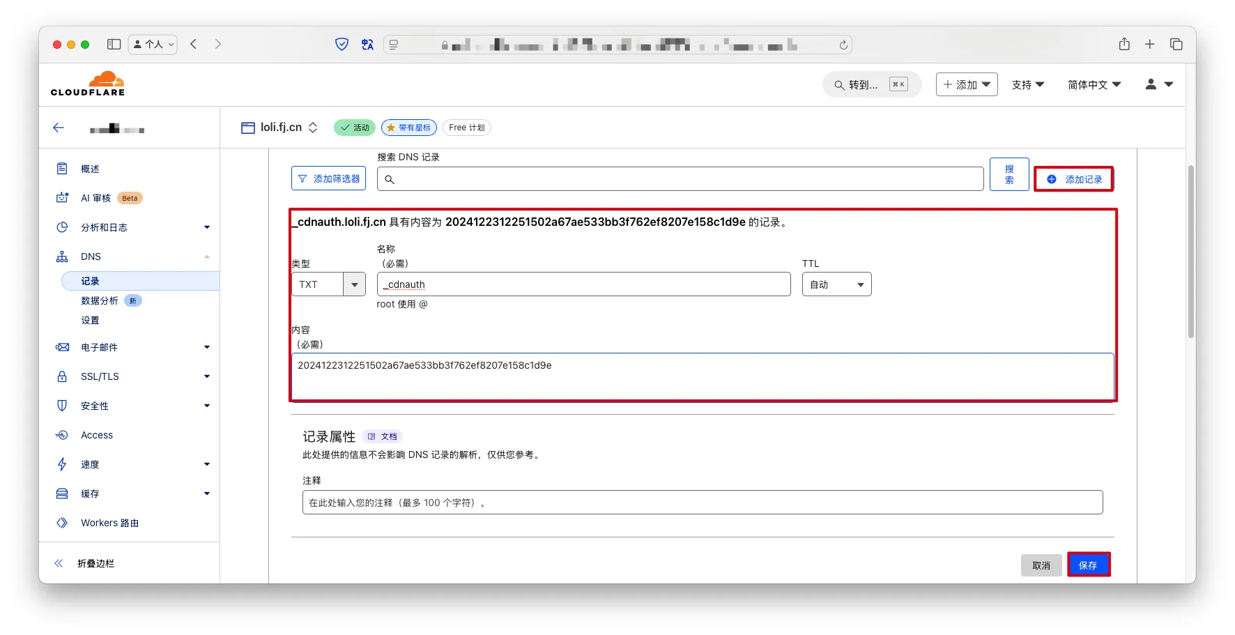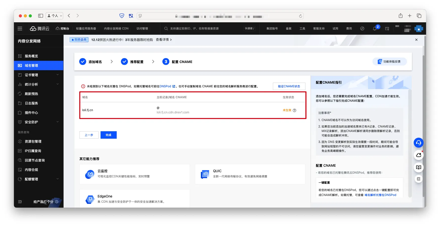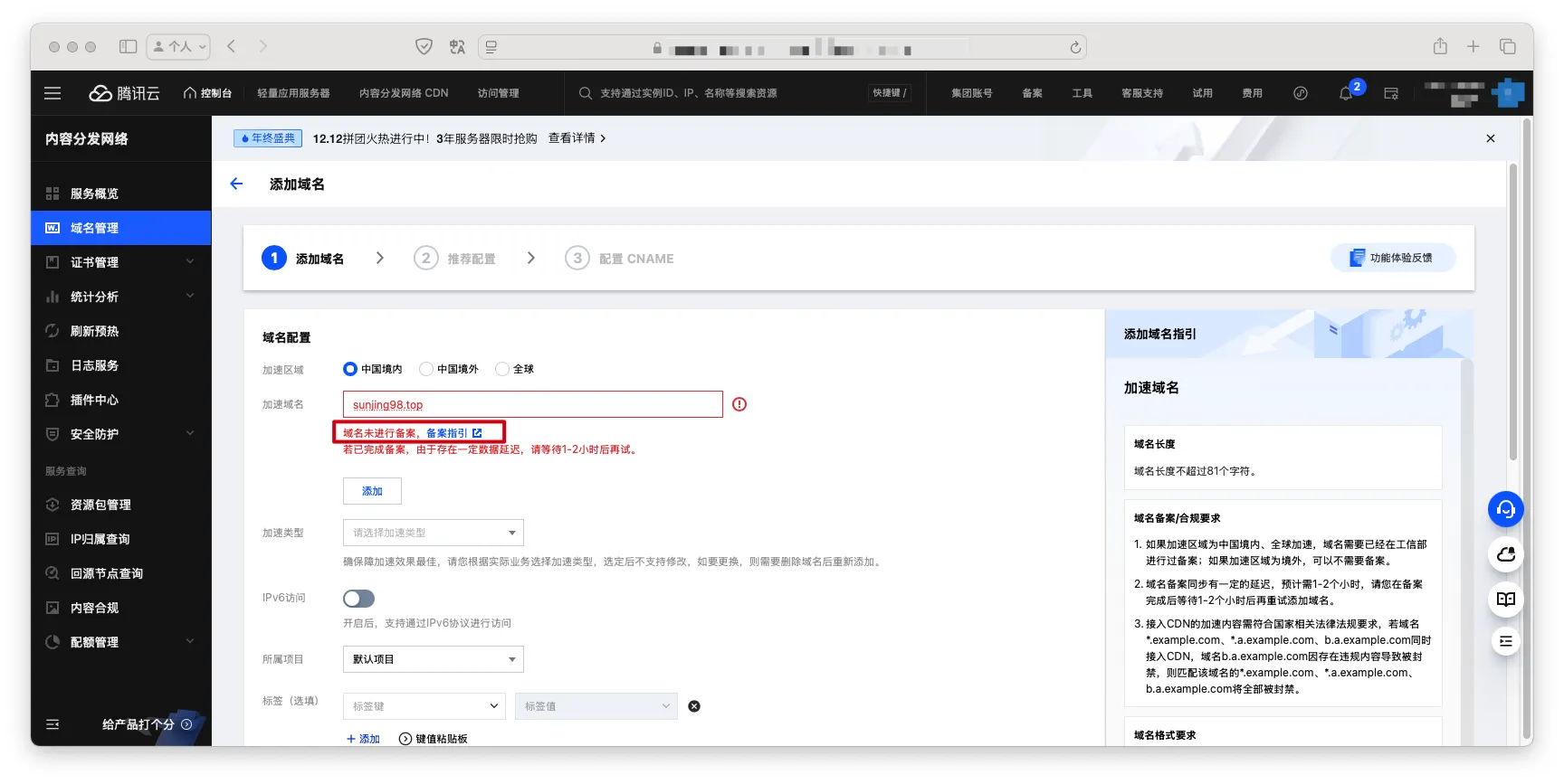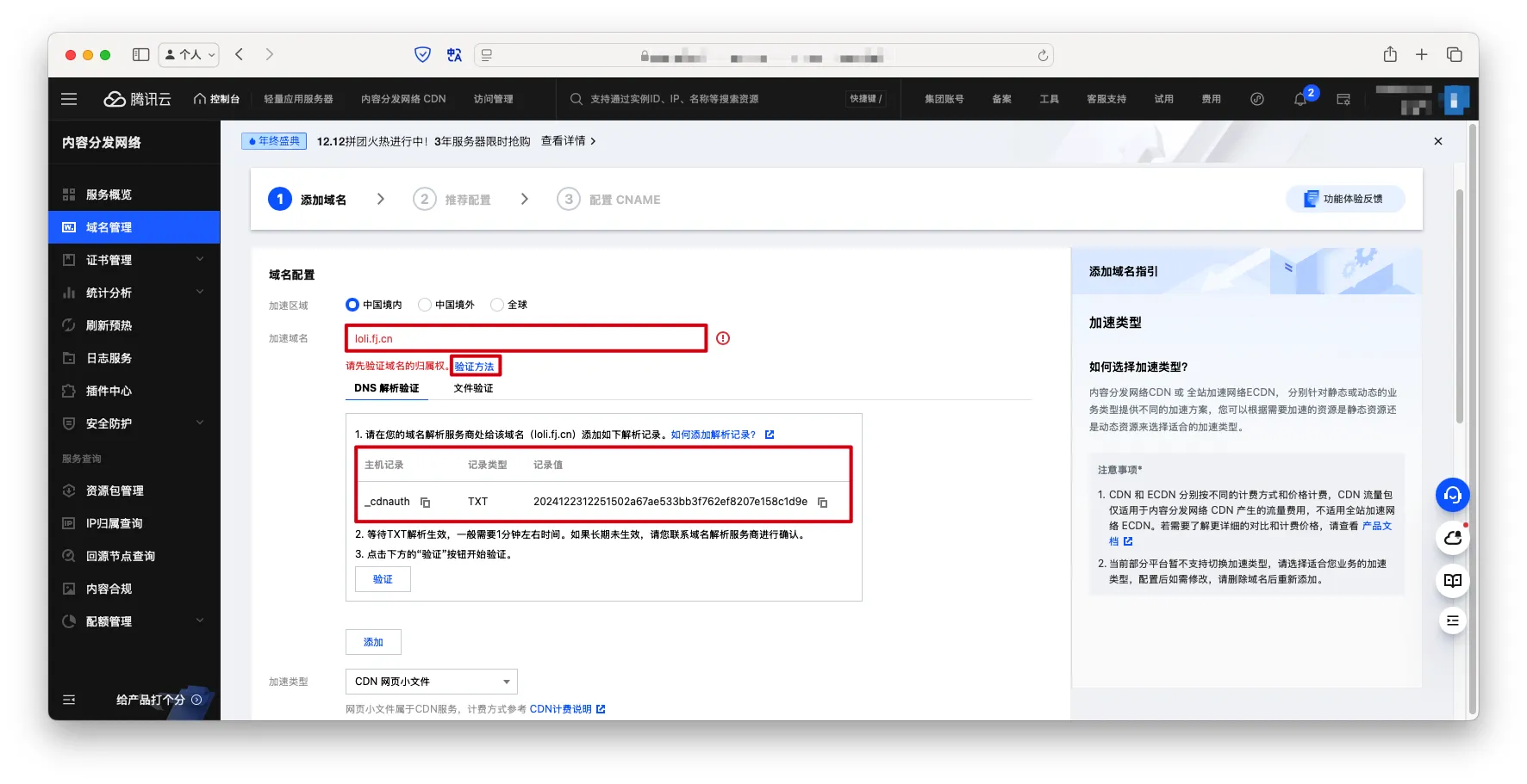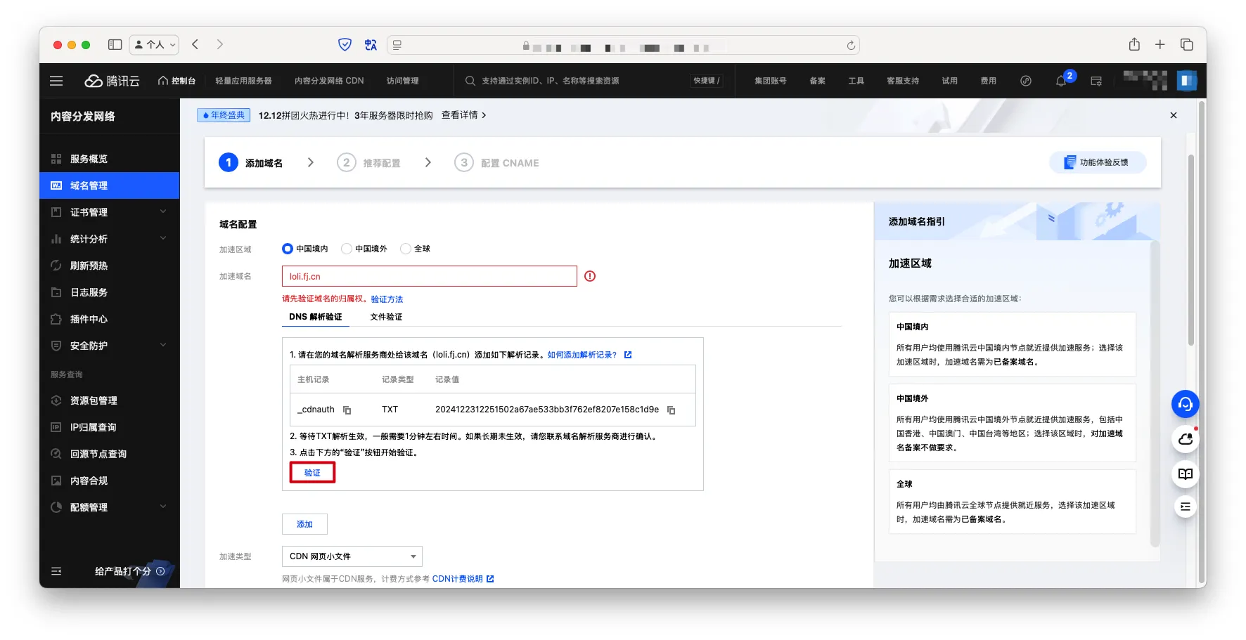 加速域名为需要被加速的域名的主域名->首次设置需要进行认证,点击验证方法,先记录需要认证的DNS解析内容