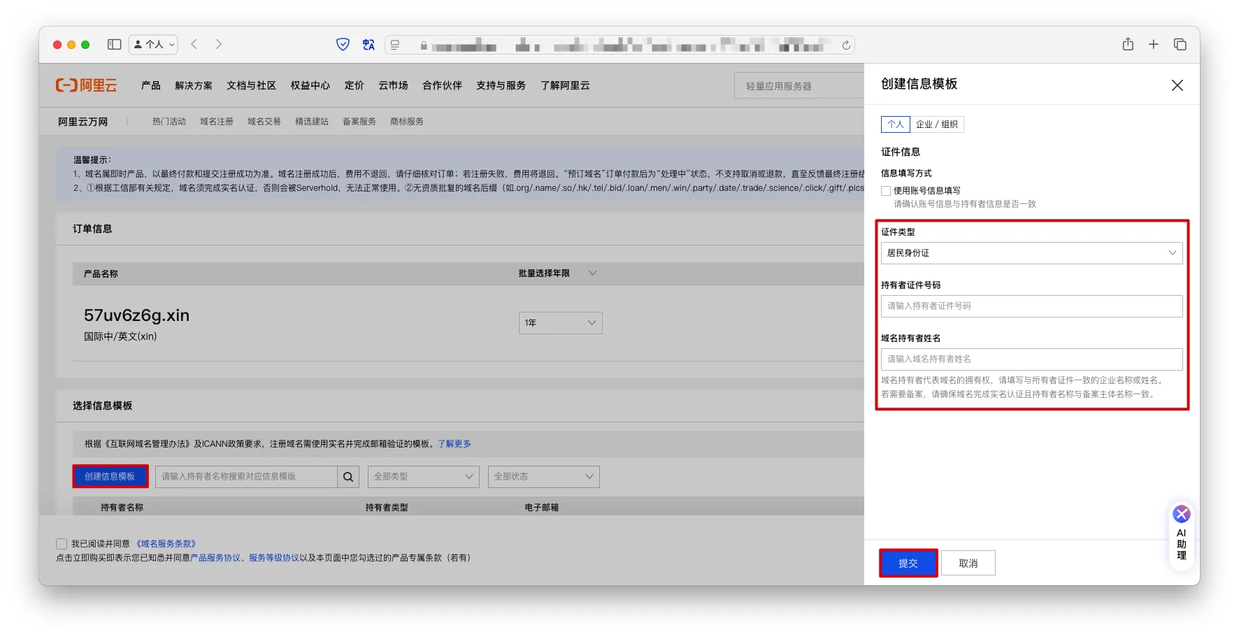 创建信息模板->输入实名认证信息->提交