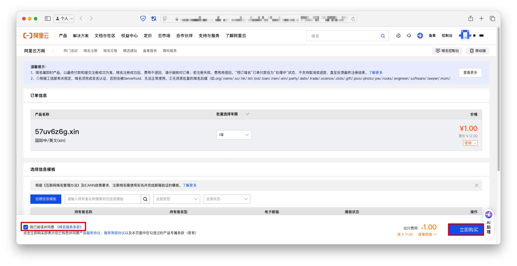 我已阅读并同意《域名服务条款》->立即购买