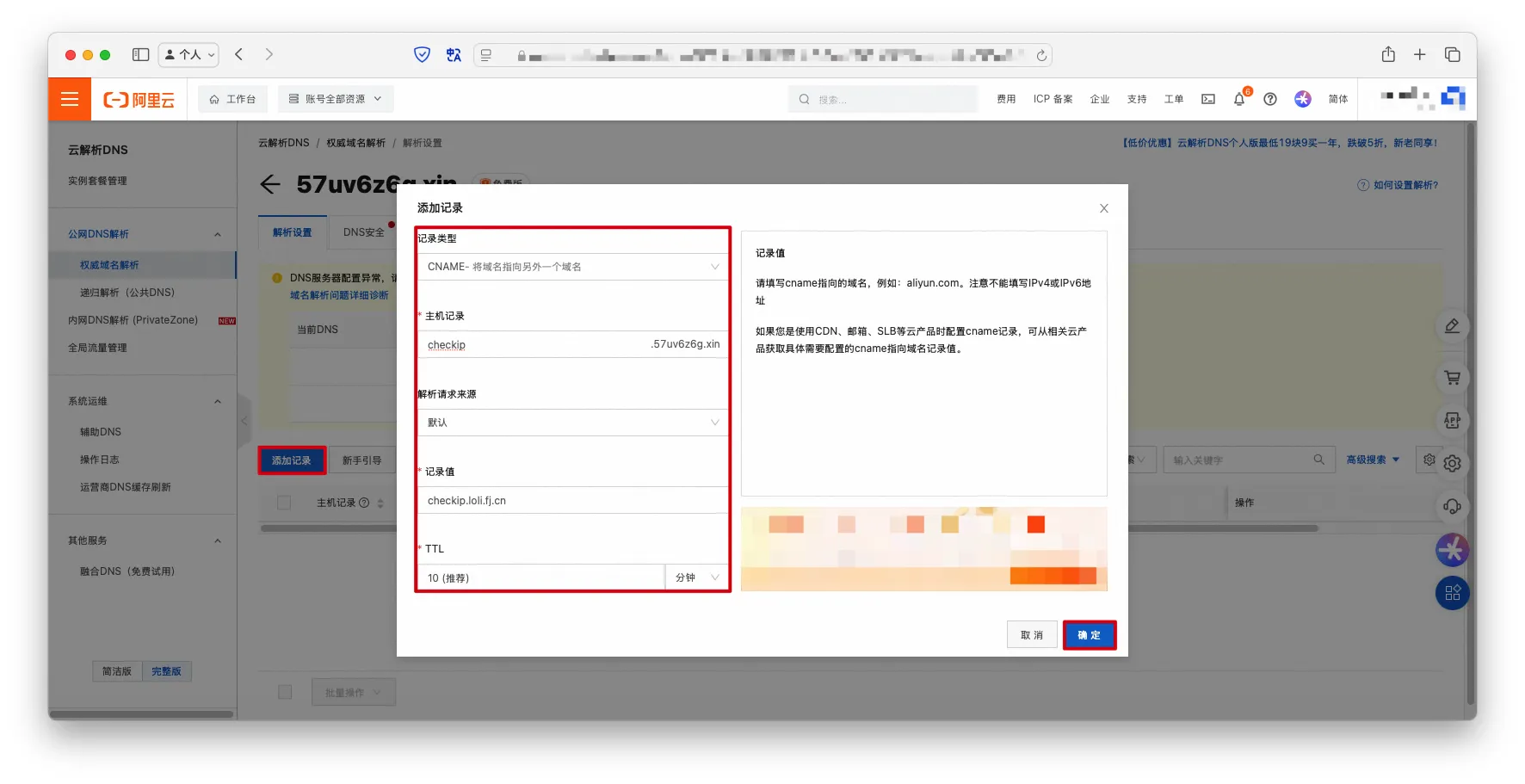 添加记录->填写域名解析内容->确定