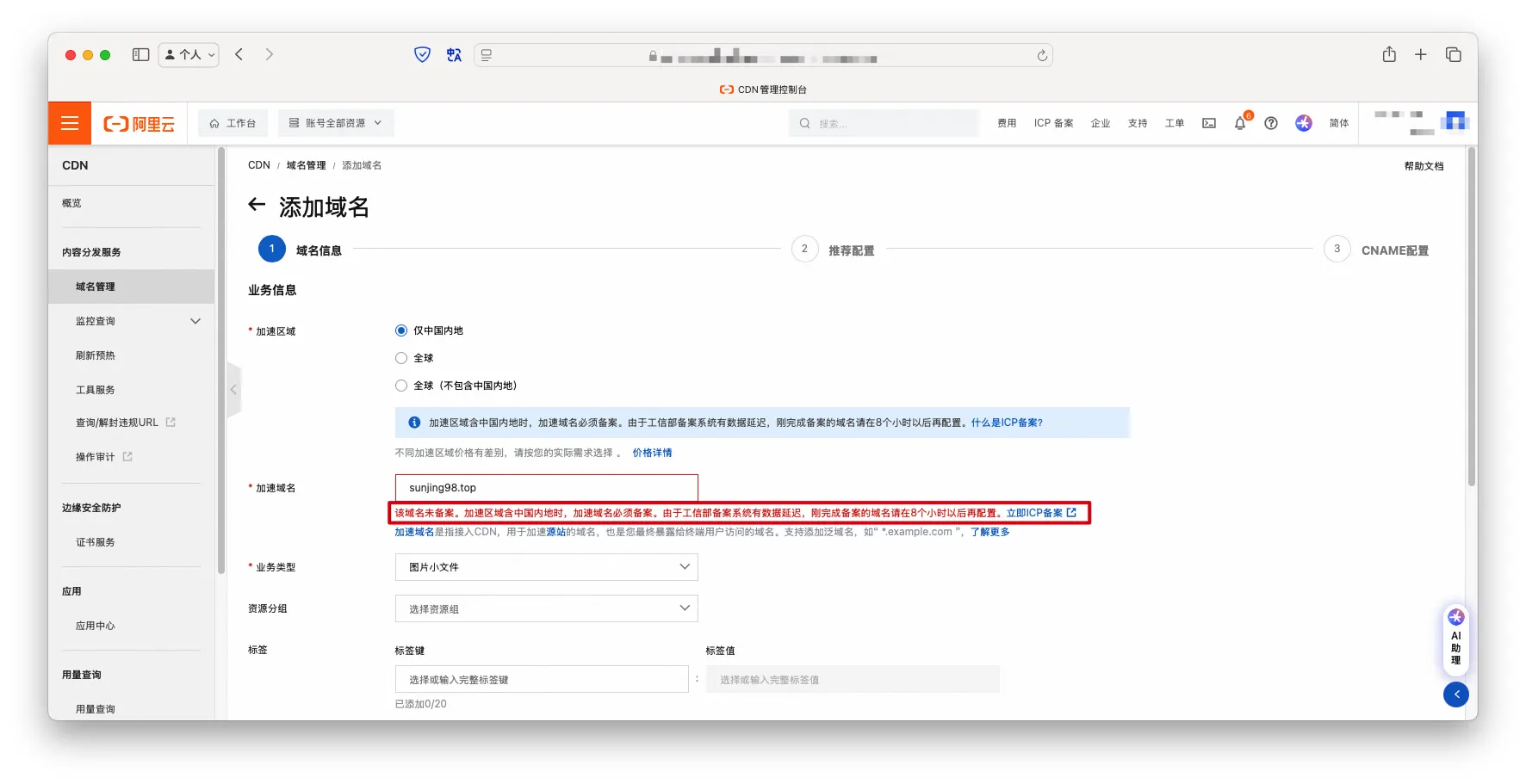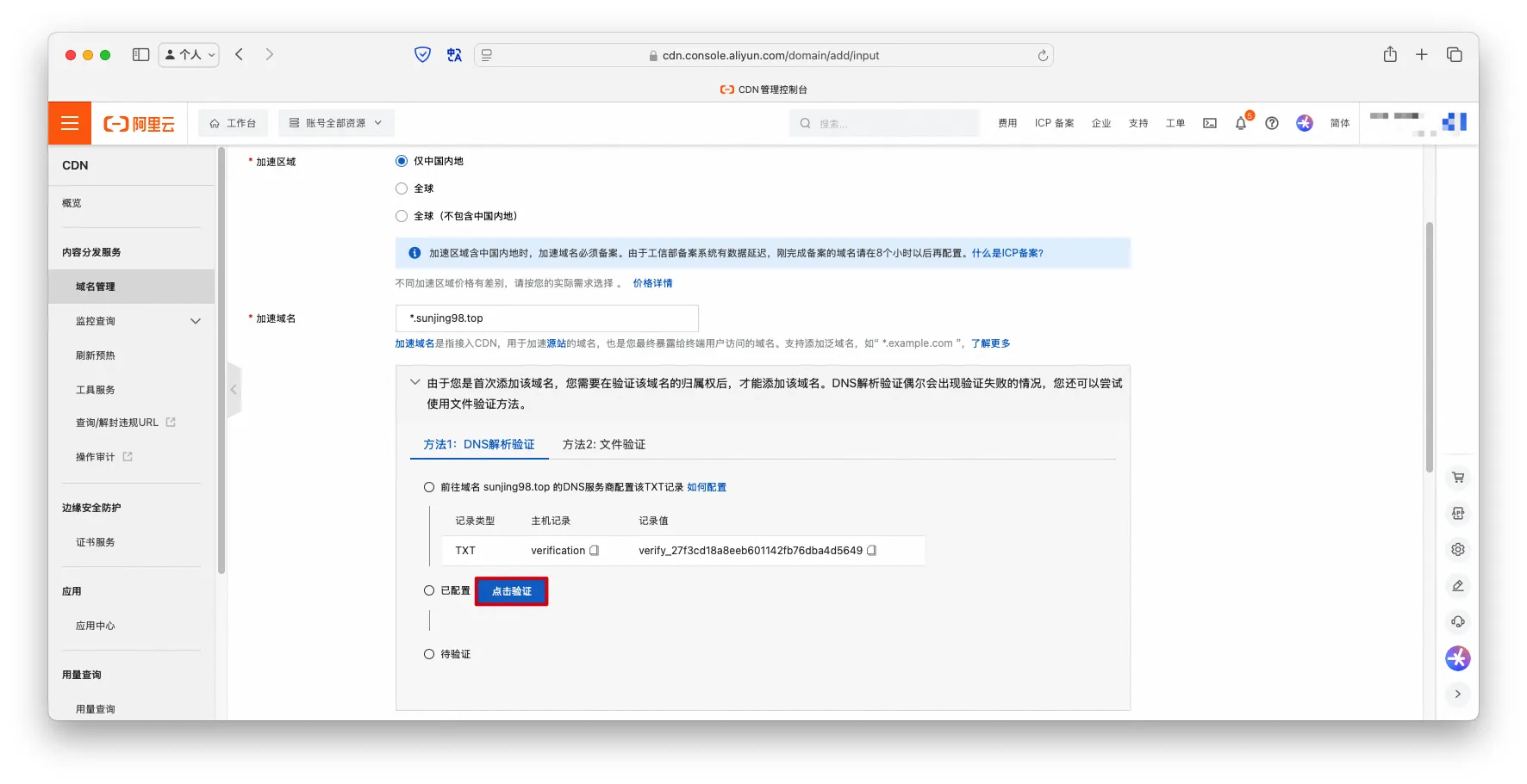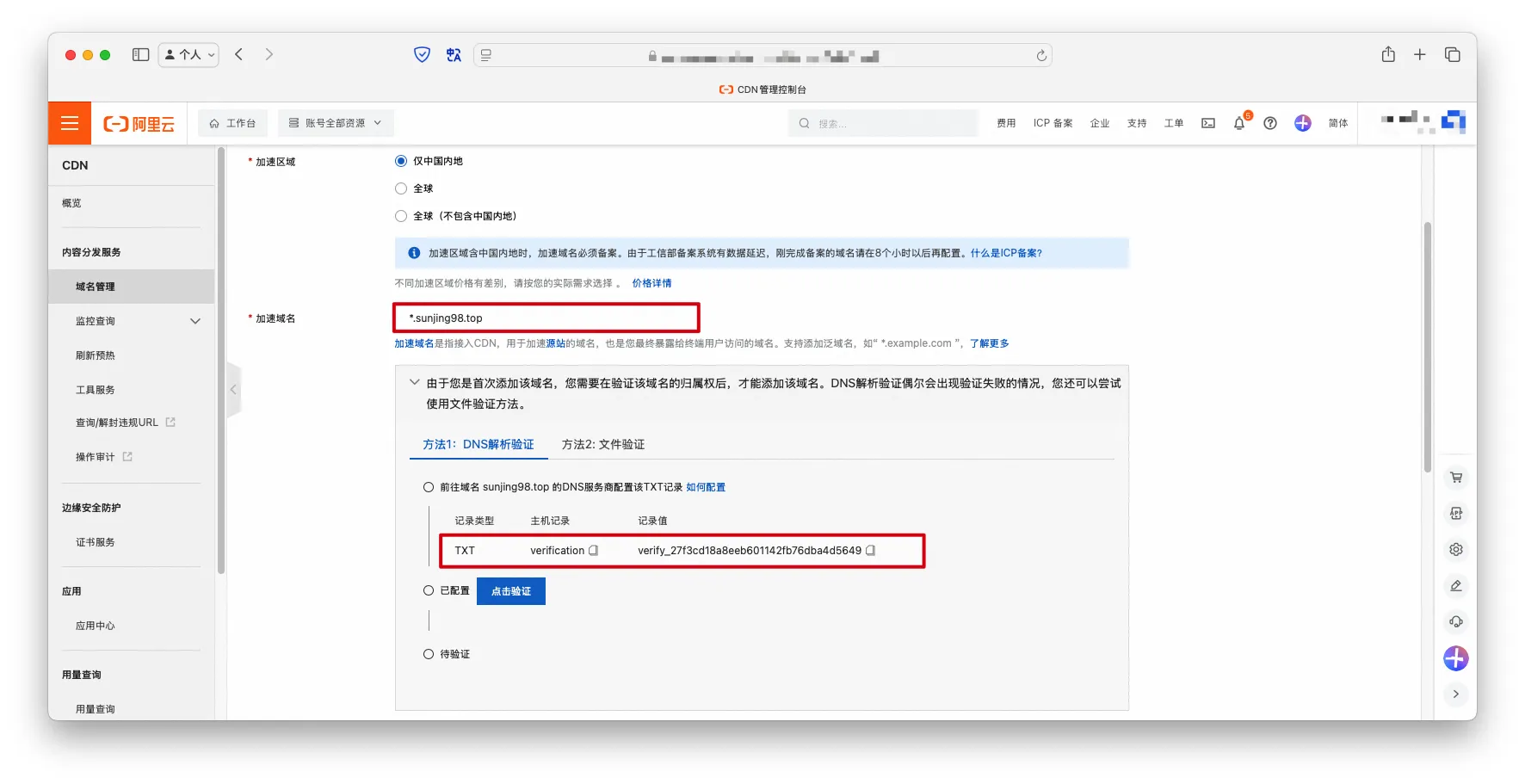 加速域名为需要被加速的域名的主域名->首次设置需要进行认证,先记录需要认证的DNS解析内容