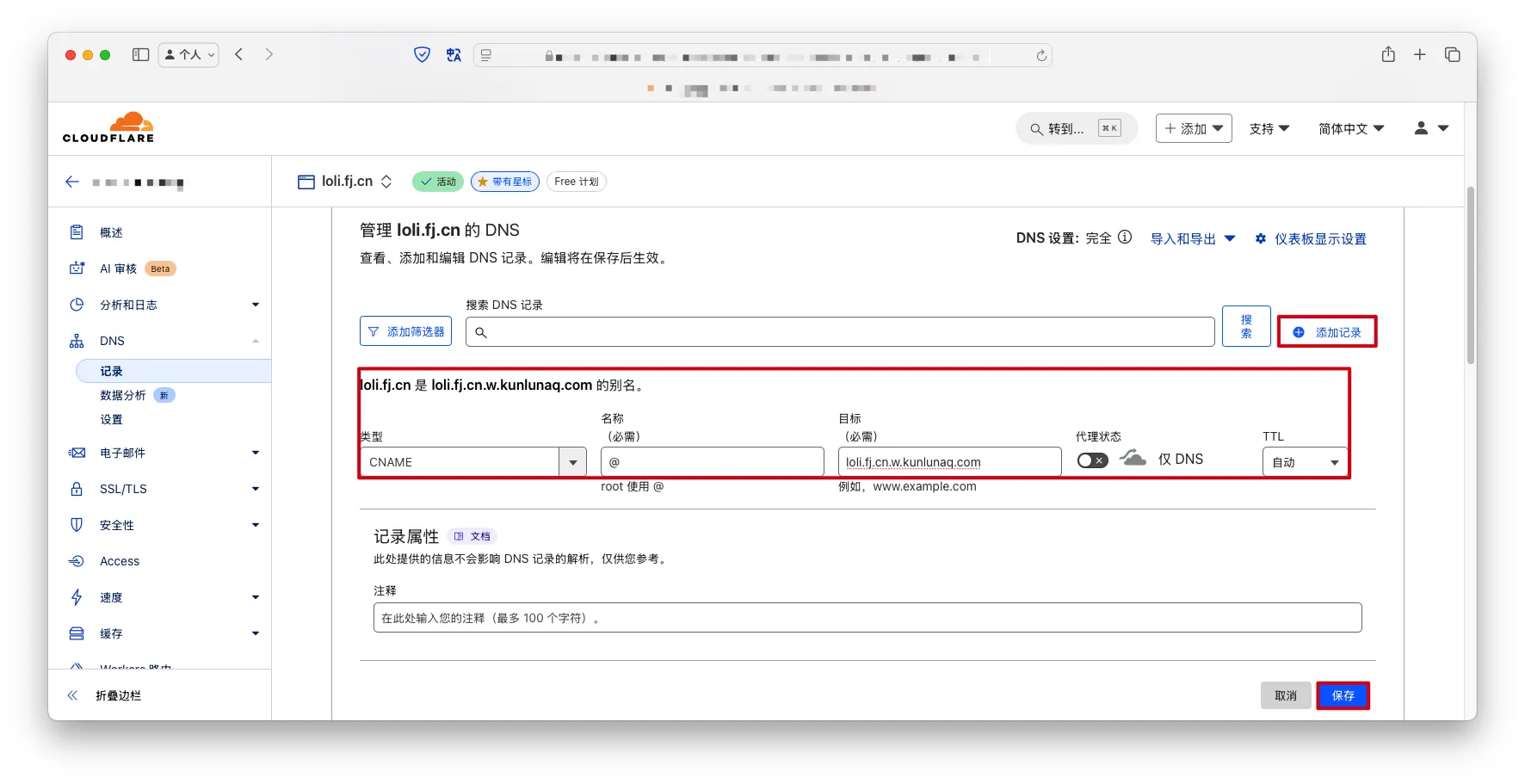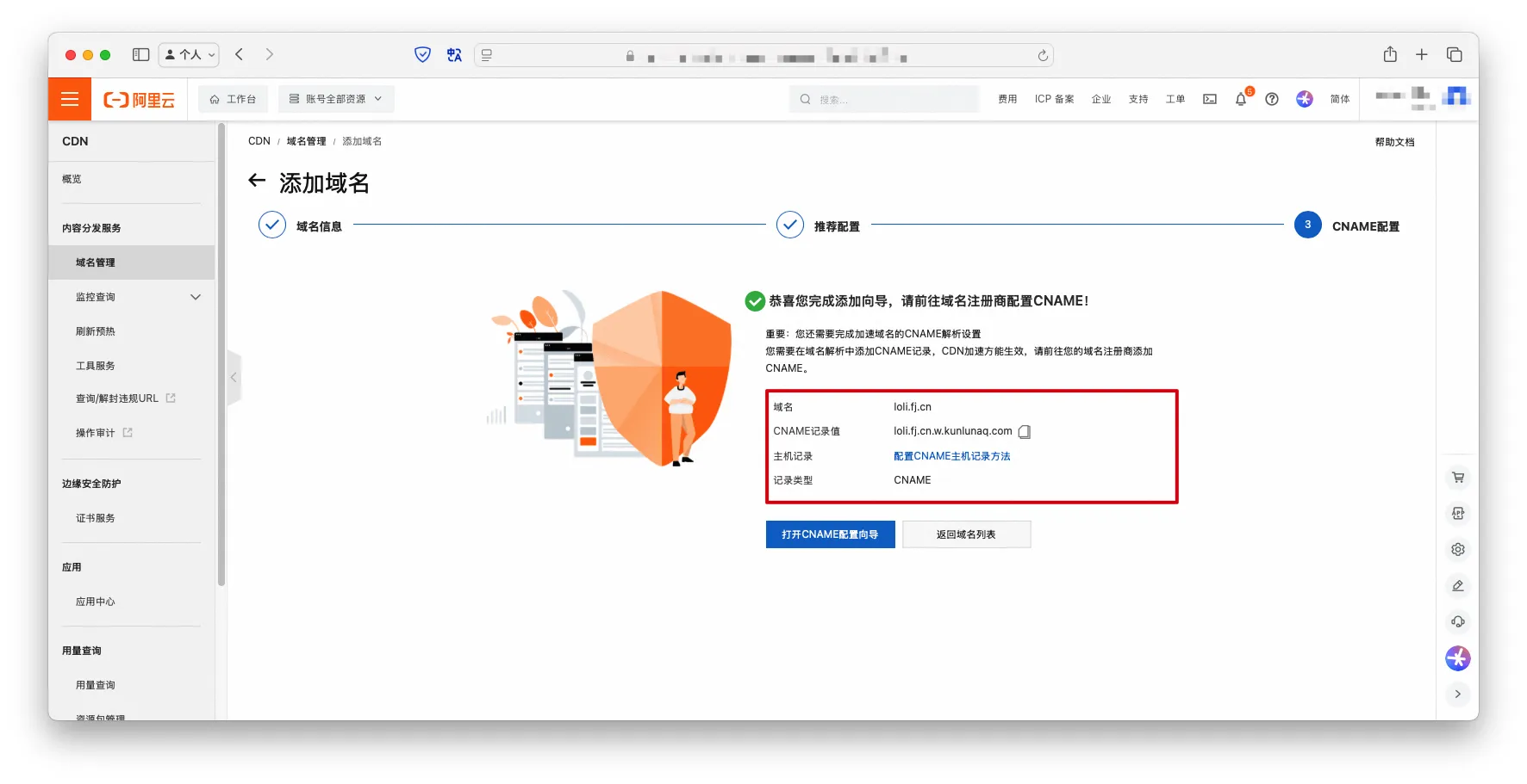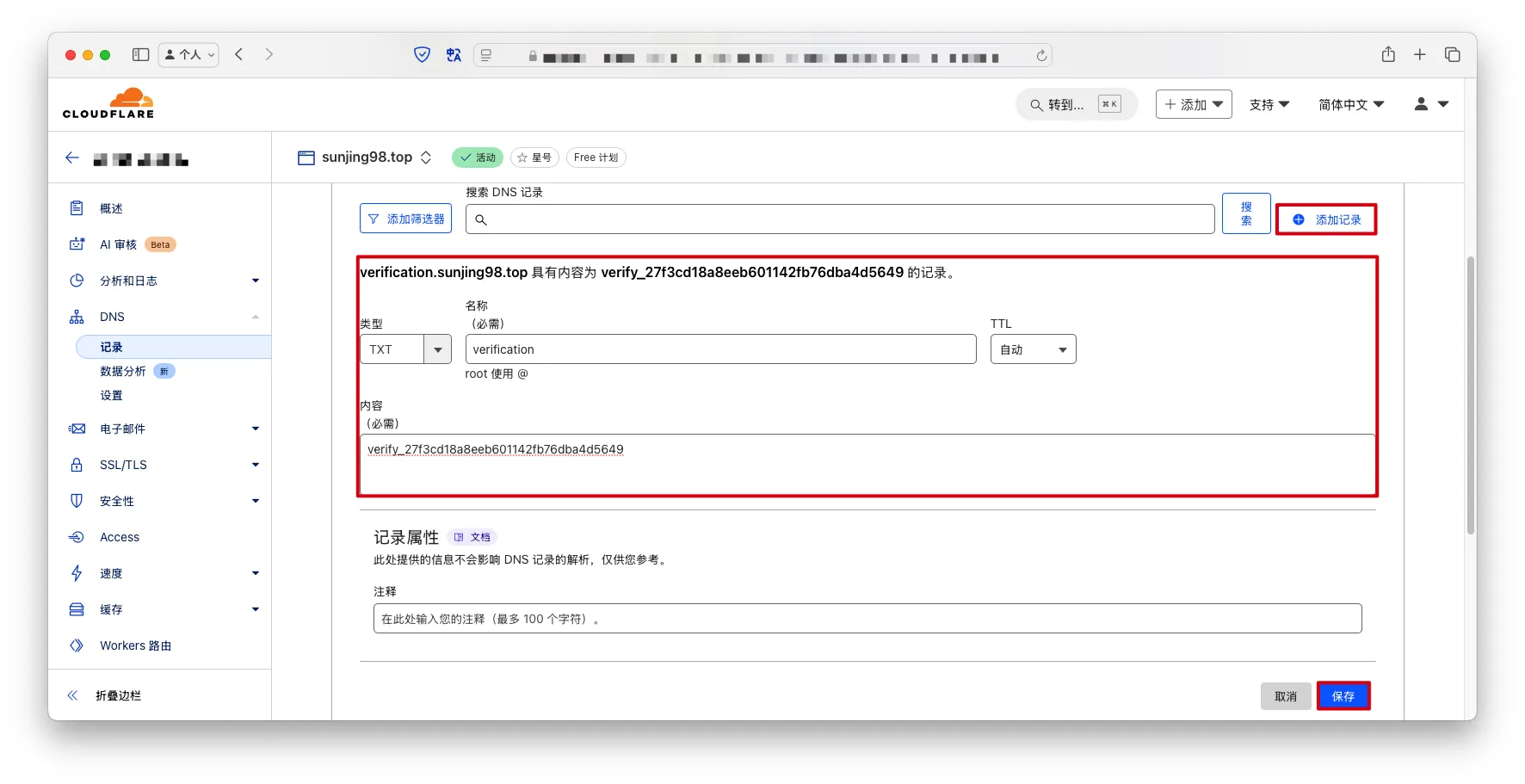 加速域名为需要被加速的域名的主域名->首次设置需要进行认证,先记录需要认证的DNS解析内容