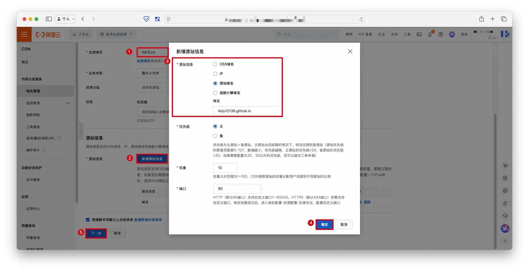 加速域名为需要被加速的域名的主域名->新增源站信息->源站信息填写需要加速的域名实际资源域名->确定