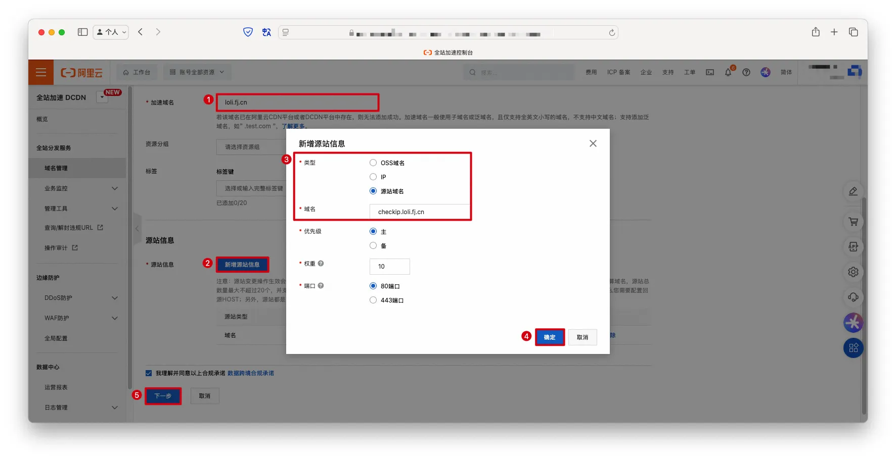 加速域名为需要被加速的域名的主域名->新增源站信息->源站信息填写需要加速的域名实际资源域名->确定
