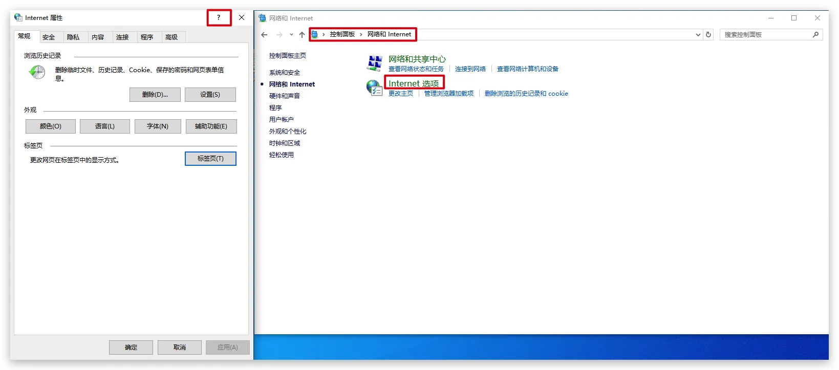 控制面板->网络和Internet->Internet选项->?
