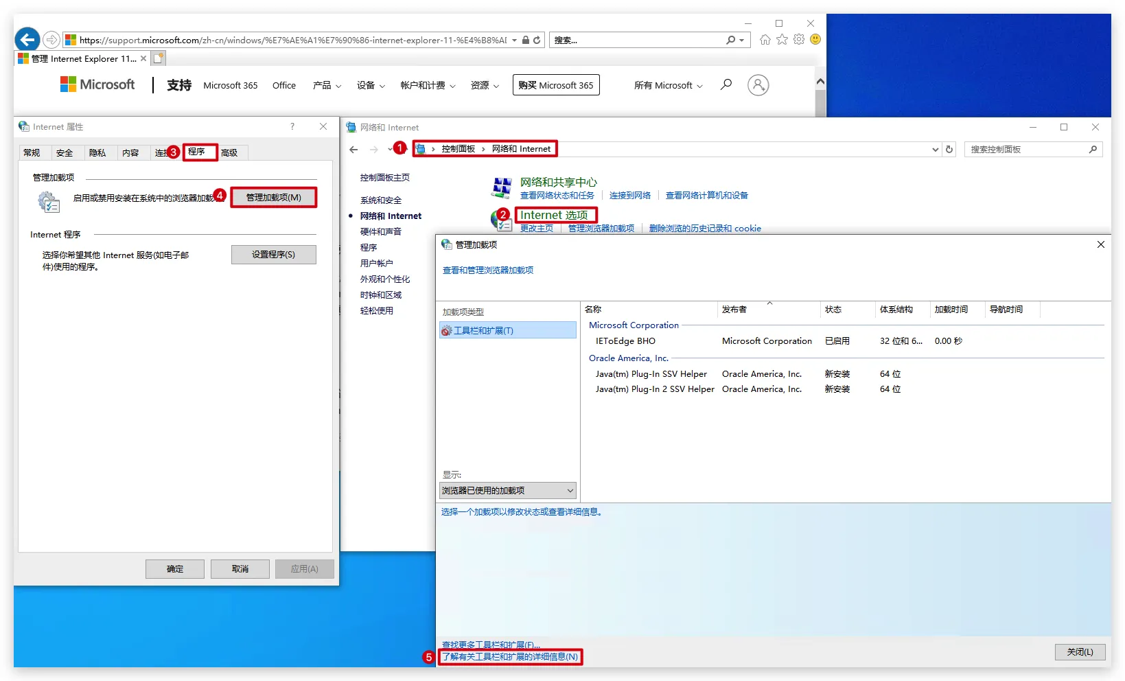 了解有关工具栏和扩展的详细信息超链接打开IE控制面板->网络和Internet->Internet选项->程序->管理加载项->了解有关工具栏和扩展的详细信息