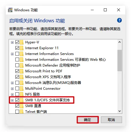 【笔记】Windows连接afp协议文件共享服务器 发表于 2024-12-26 更新于 2025-12-18 阅读次数: 前言Windows连接afp协议文件共享服务器 正文 控制面板->程序->程序和功能->启用或关闭 Windows 功能 勾选SMB 1.0/CIFS 文件共享支持->确定 等待安装完成 直接通过\\<ip>\<dir>访问 如果这个IP地址同时有SMB服务和AFP服务,那么会优先连接SMB服务 完成参考文献ihowto.tips