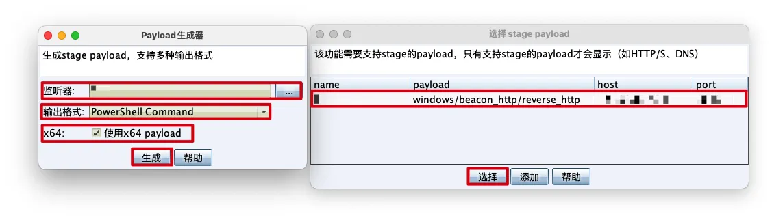 监听器选择上一步骤创建的监听器,输出格式选择PowerShell Command,根据需要在x64勾选或取消勾选使用x64 payload->生成