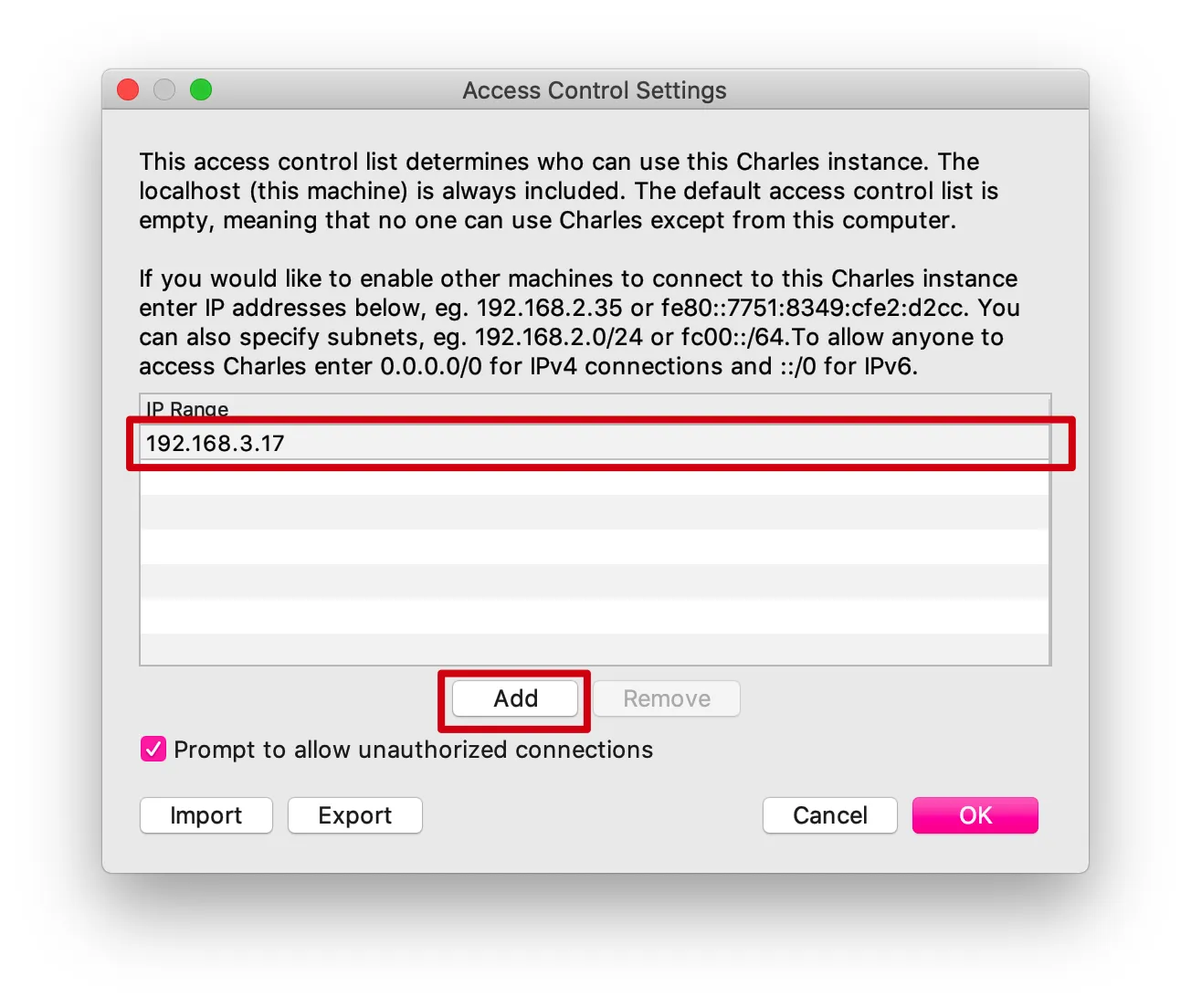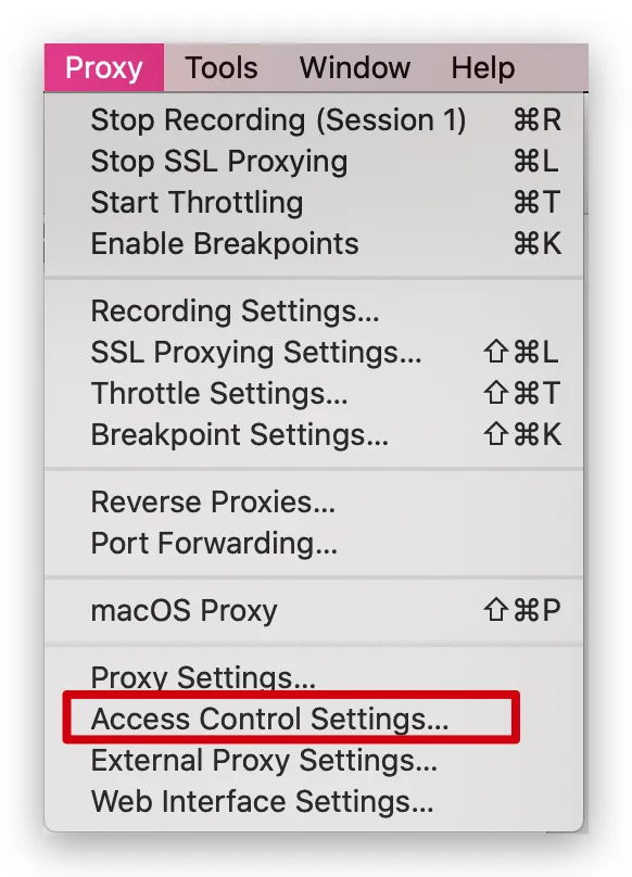 【踩坑】Charles报错 发表于 2025-02-14 更新于 2025-12-15 阅读次数: 前言Charles报错:Denying access from address not on ACL 解决问题 Proxy->Access Control Settings 将需要被抓包的设备的ip地址配置到Access Control Settings即可 完成