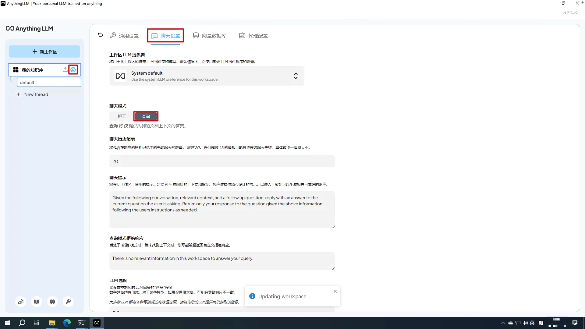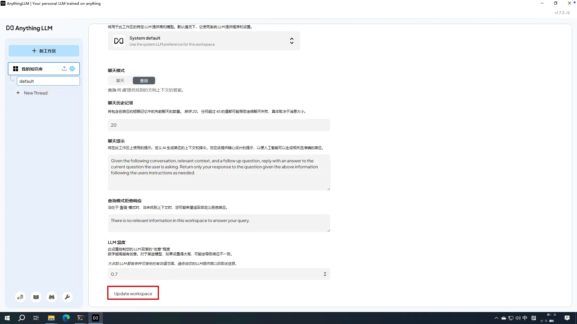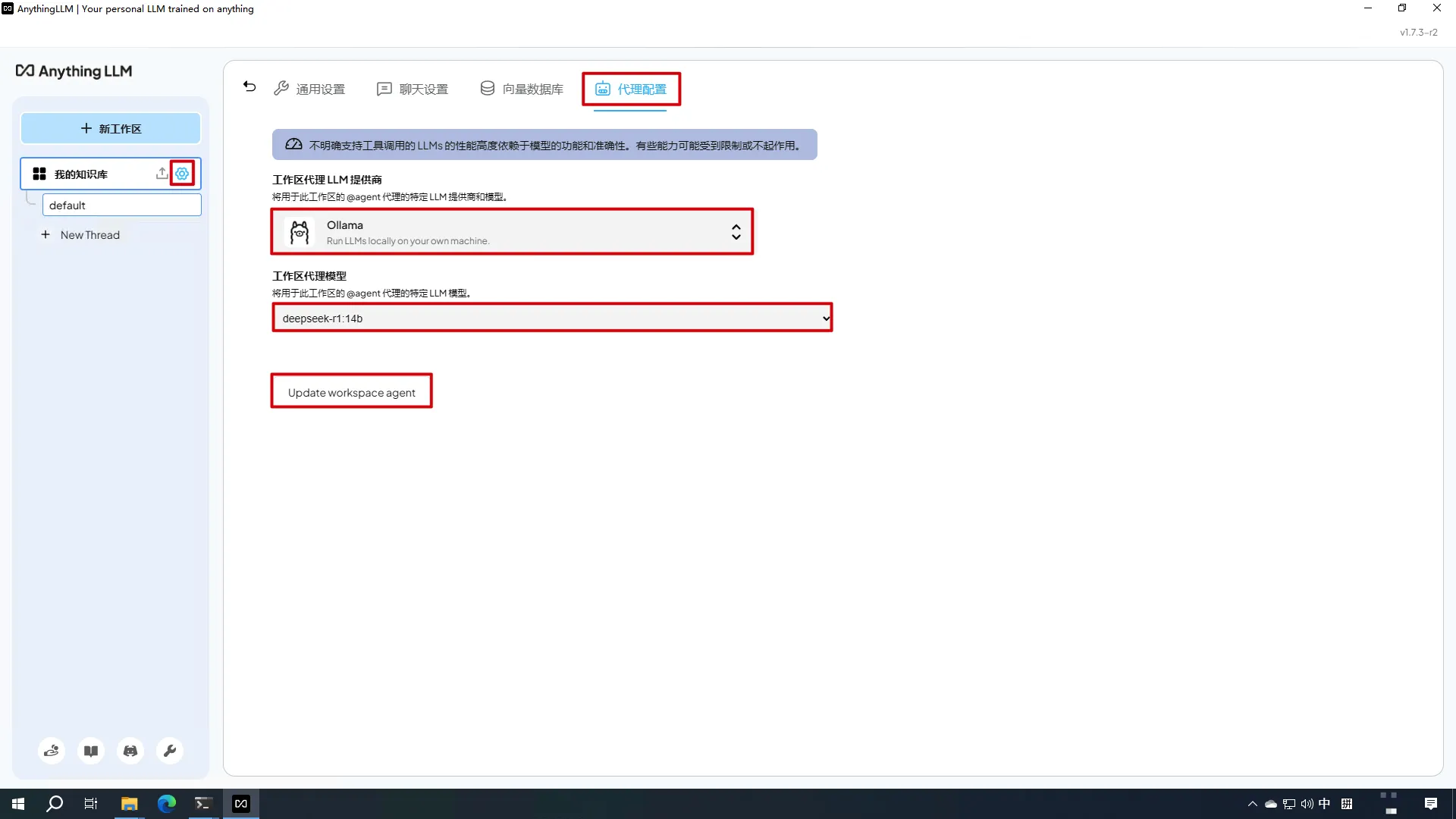 代理设置->选择工作区代理LLM提供商和工作区代理模型->Update workspace
